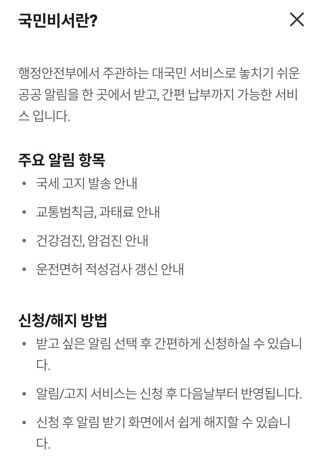 일단 어디서 이용하겠다고 정했으며, 거기는 알람이나 팝업을 최소화하지 말고 주기적으로 확인하는 버릇을 들여야할 것 같네요. 신청할 수 있는 서비스 중에는, 무시하거나 확인하기를 잊어버렸다가는 불이익를 받을 수 있는 것도 있습니다.