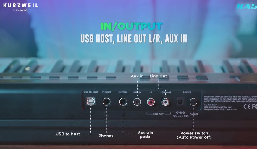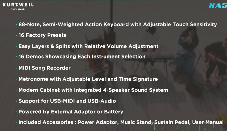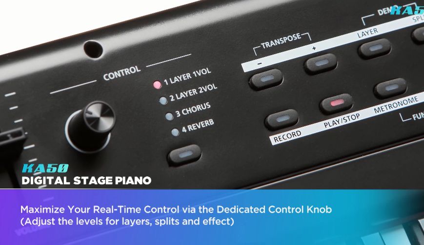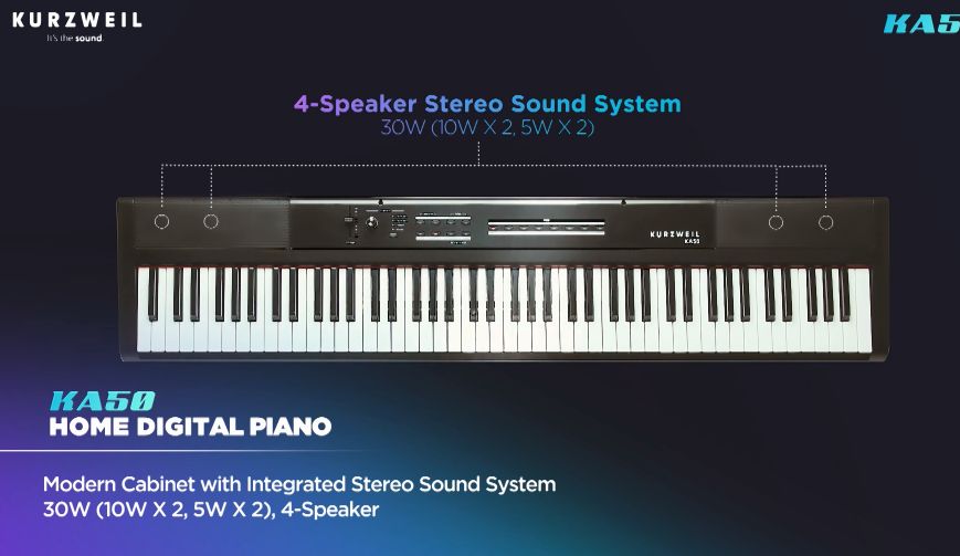 KA-50은 세미 웨이티드 건반. 동시발음수는 32개. 4 스피커 스테레오.