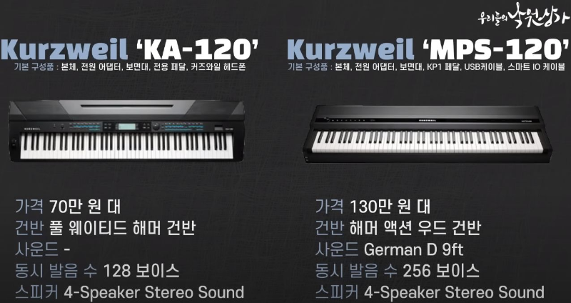 아래 영상의 2분 46초부터. 영창 커즈와일 라인업, KA-50이 엔트리급, 그리고 그 위에 KA-90, KA-120, MPS-120 이 있다면서 설명하고 시연하는 영상.