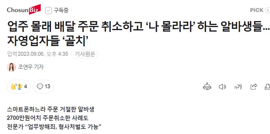 업주 몰래 배달 주문 취소하고 ‘나 몰라라’ 하는 알바생들...자영업자들 ‘골치’