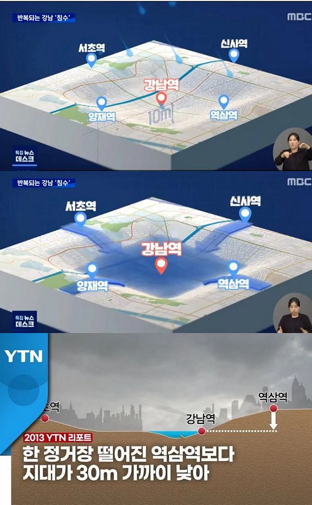 축소/취소한 쪽에서는 아마 자연(땅)에 맡기자는 식이었겠지만, 도심 환경미화가 기본적으로 땅이 물을 먹지 못하게 하는 공사가 대부분이라2 배수가 안 되면 물난리는 날 수밖에 없는 것이었습니다. 사실, 순진하게 생각하면 물내려가는 게 버리는 것 같아서 아깝거든요. ㅎㅎ 하지만 도시는 포장덩어리니 저 마지막 그림 단면도 지형이, 배수가 잘 안 되면 그냥 그 자체로 거대한 물그릇인 겁니다. 저도 토목공학을 몰라 그런 느낌을 받았는데, 한편으로는 배수가 안 되거나 잘못 되면 물도 차거니와 땅이 건물을 지지하지 못한다거나 싱크홀이 생긴다든가하는 일도 있는 모양이라..
