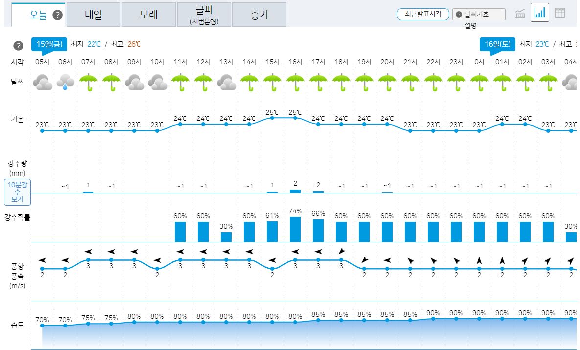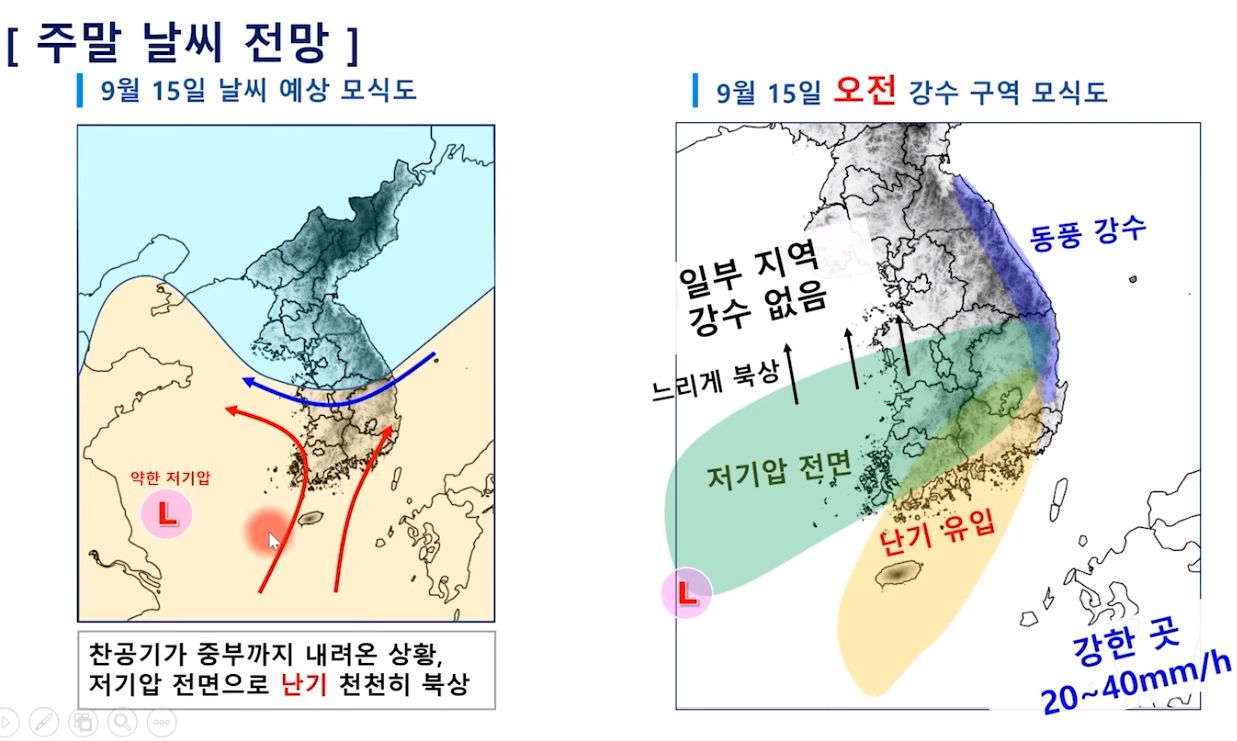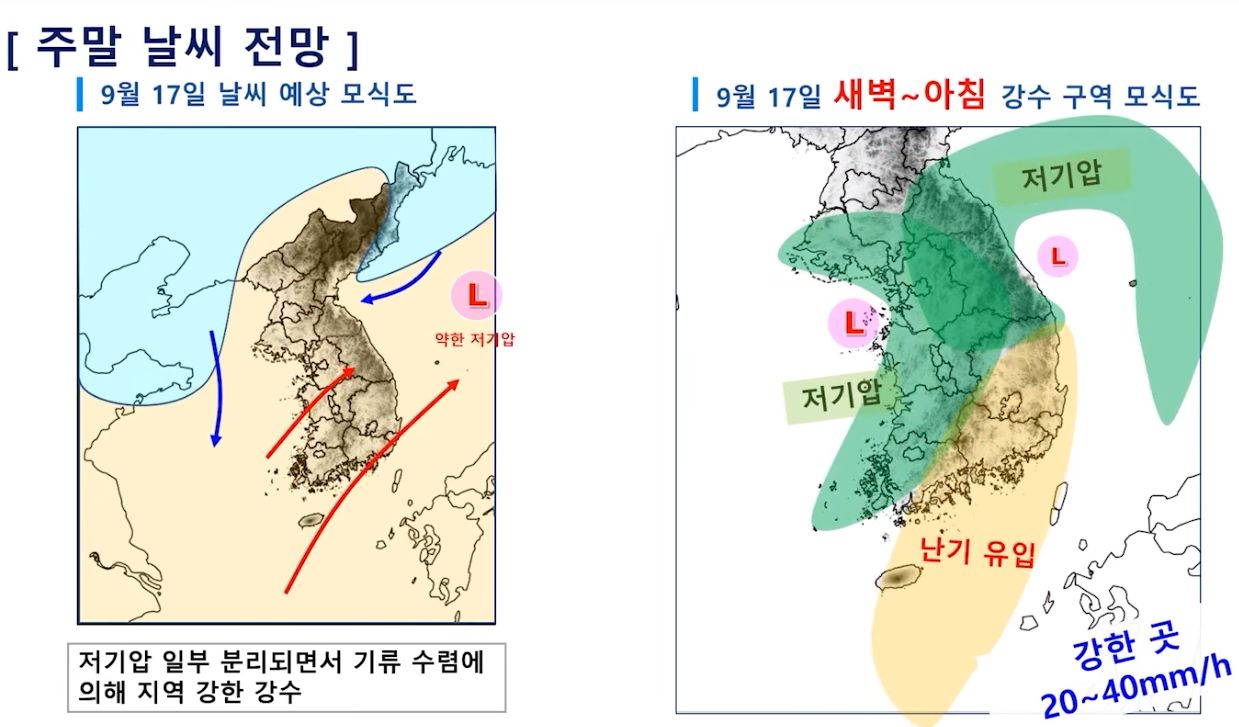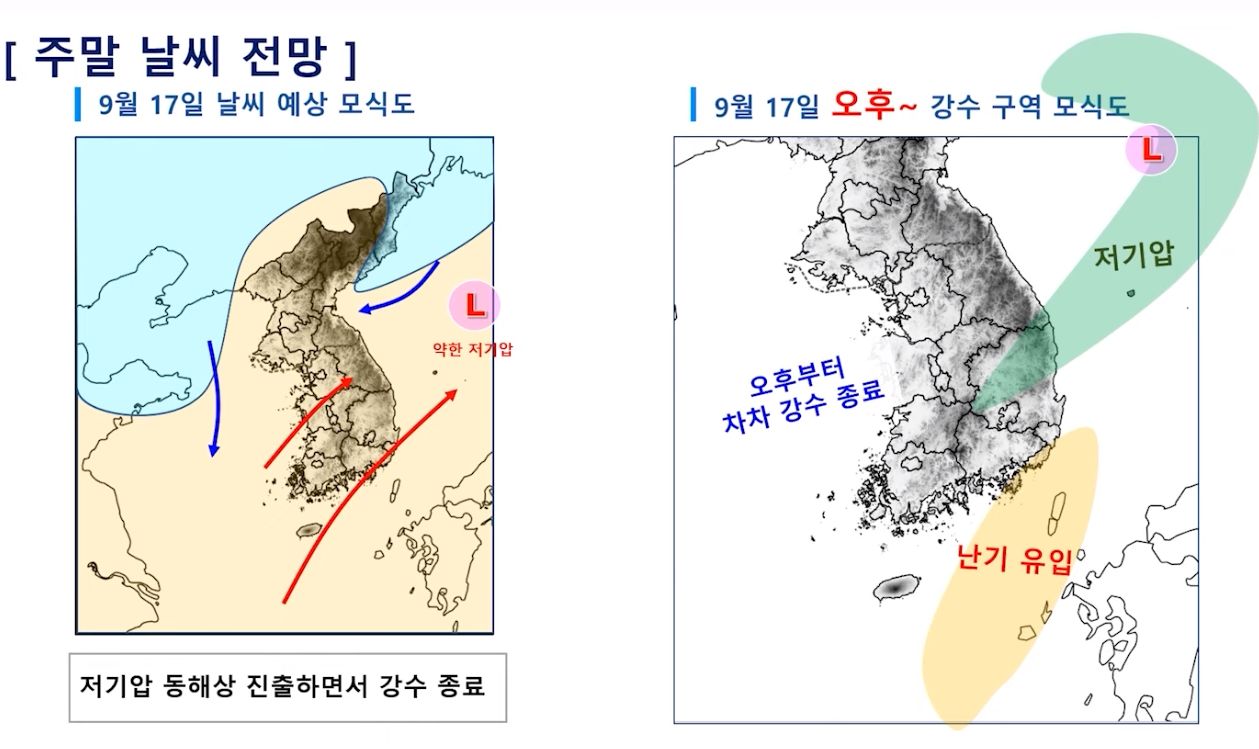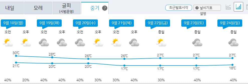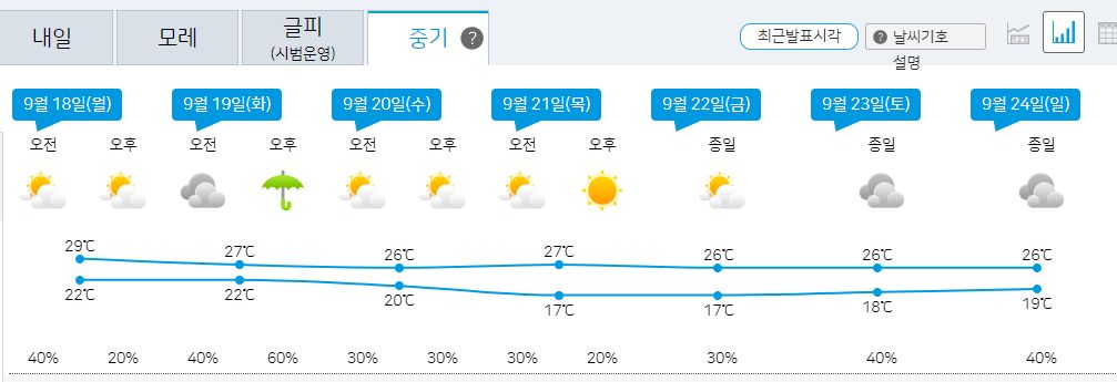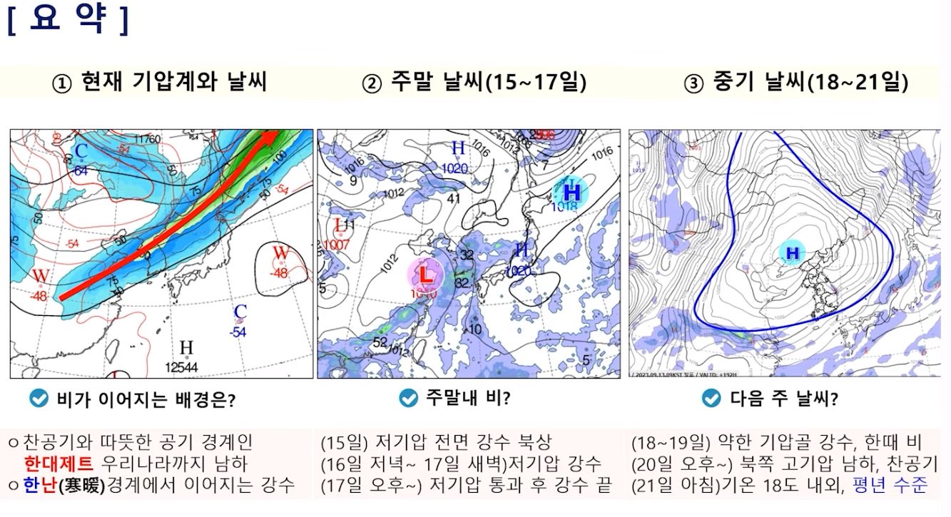 2023.9.15.금.~ 9.24.일. 서울-대전 주말날씨, 중기예보 (기상청): 일요일까지 비. 이후 소나기 가능 본문