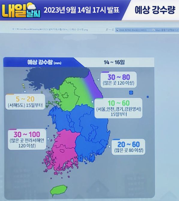 [기상청 브리핑] 15일 다시 전국 비! 비 온 뒤 기온은? 17일 오후부터 비 그칠것 2023.9.14. 17시 예보