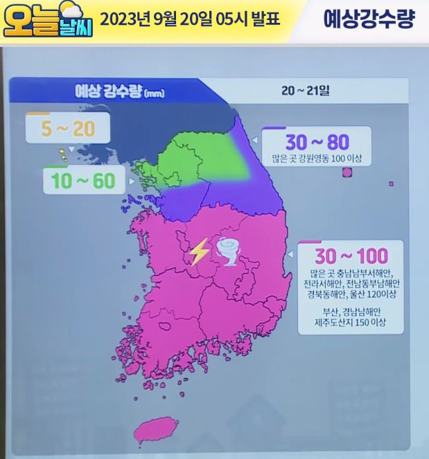 2023.9.20(수)~21(목). 기상청 예보: 오늘 전국 비 오락가락, 내일 수도권제외 전국. 강원영동과 남부해안지방은 곳에 따라 많은 비 본문