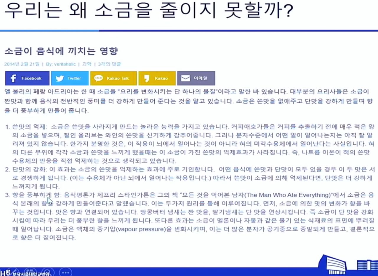 ㅡ 소금은 식욕을 돋우기 때문에 비만 (소금 덜 먹는 게 습관이 되면 소금을 많이 먹으면 쓴맛을 느낀다고 한다)
