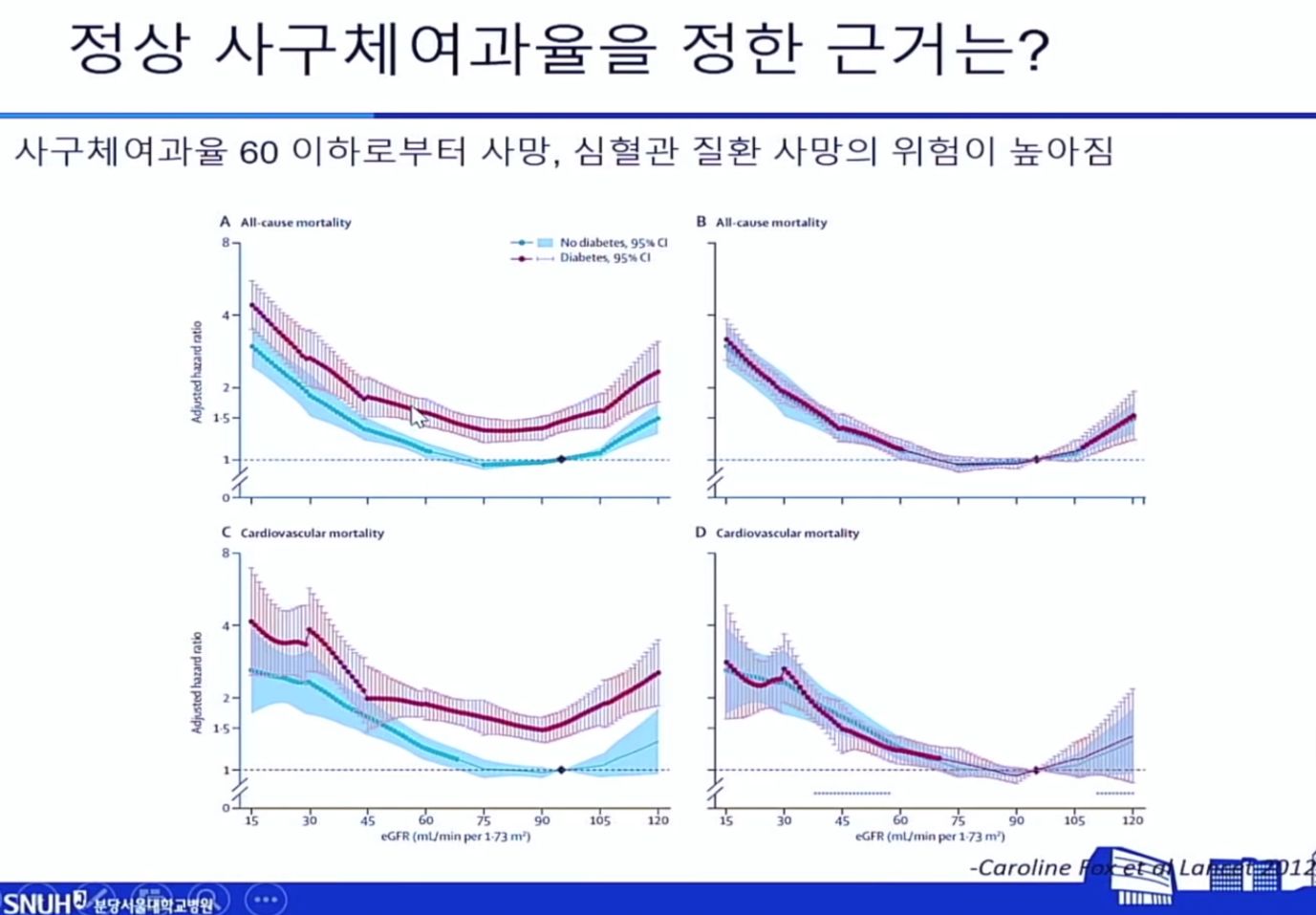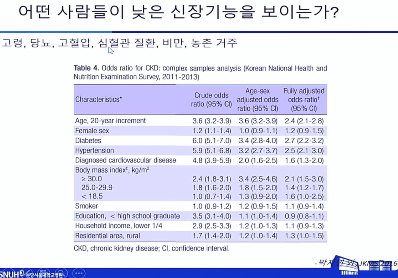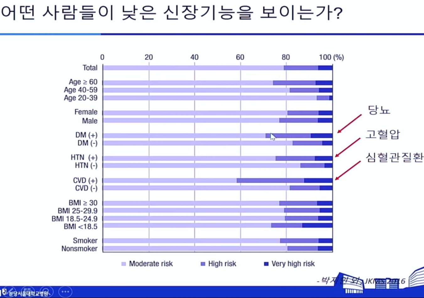 심혈관질환이 있는 사람은 신장기능도 낮은 경우가 많았다. 그 다음이 고혈압, 그 다음이 당뇨.