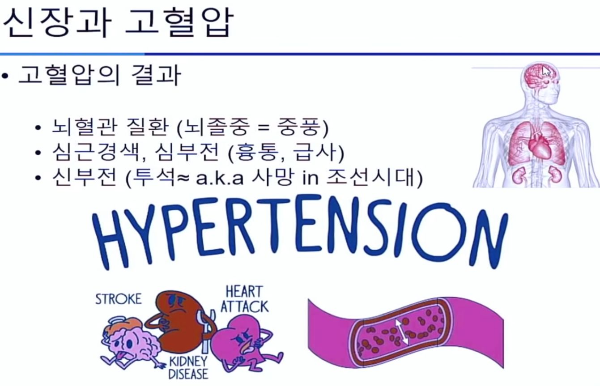 고햘압 -> 뇌혈관 질환(뇌졸중, 중풍), 심근경색, 심부전(흉통, 급사), 신부전(투석.. 투석못하면 사망)
