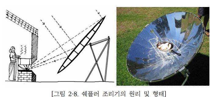쉐플러조리기는 큰 오목거울로 반사시킨 태양광으로 최고 약 1000도까지 온도를 올리는 것.