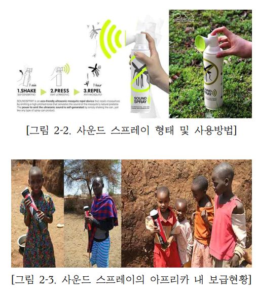 사운드 스프레이는 우리나라 KAIST에서 만든 것으로, 흔들어 에너지를 저장하고 버튼을 누르면 초음파가 나와 모기기피제역할을 하는 것. 범위는 넓은데, 이것에 당한 모기가 얼마나 그 주변을 기피할지 지속시간은 어느 정도인지 궁금한데..