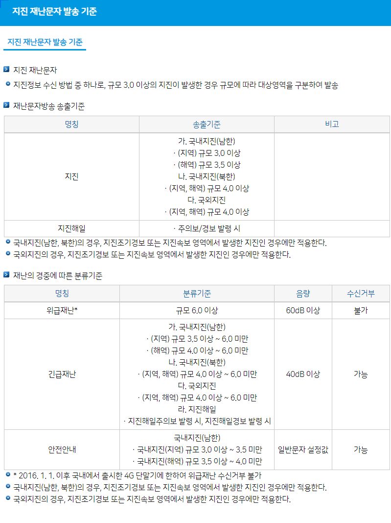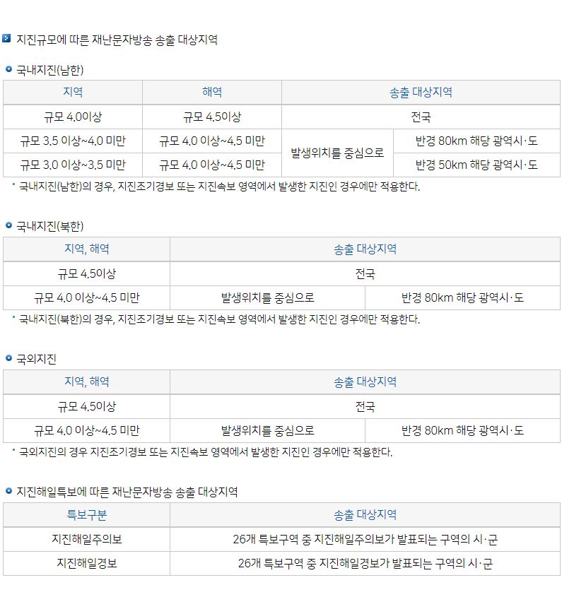 지진 재난문자 발송 기준 (기상청)