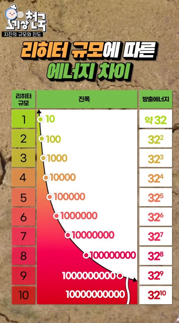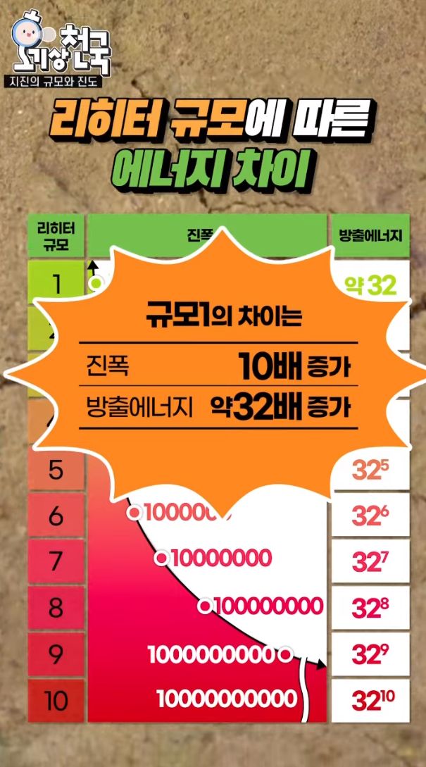 리히터 규모에 따른 지진에너지 차이