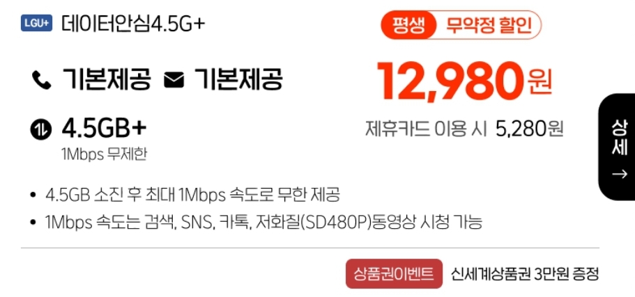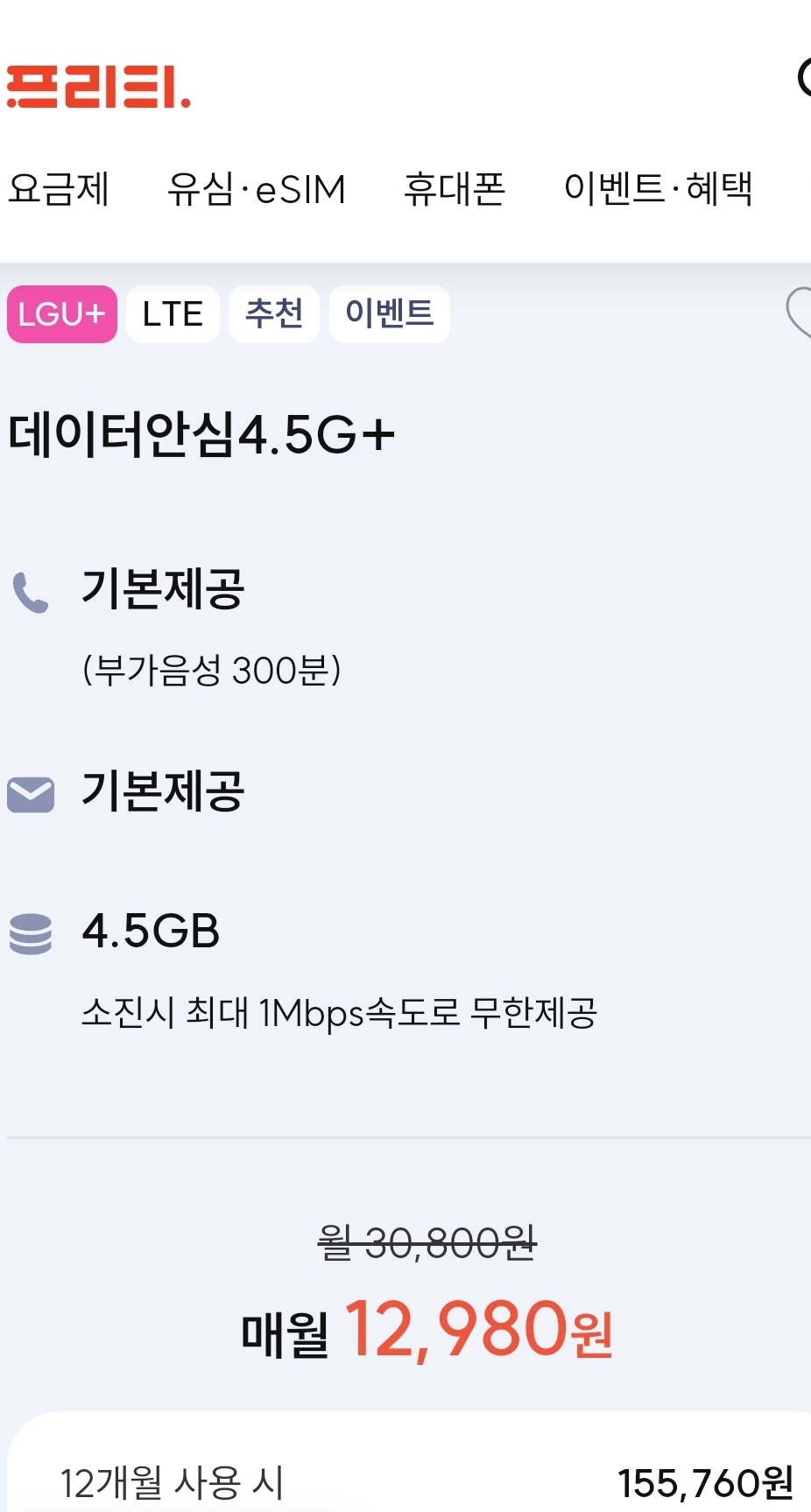 데이터안심4.5G+ https://www.freet.co.kr/plan/ratePlan/detail?svcCd=ANSIM45_1