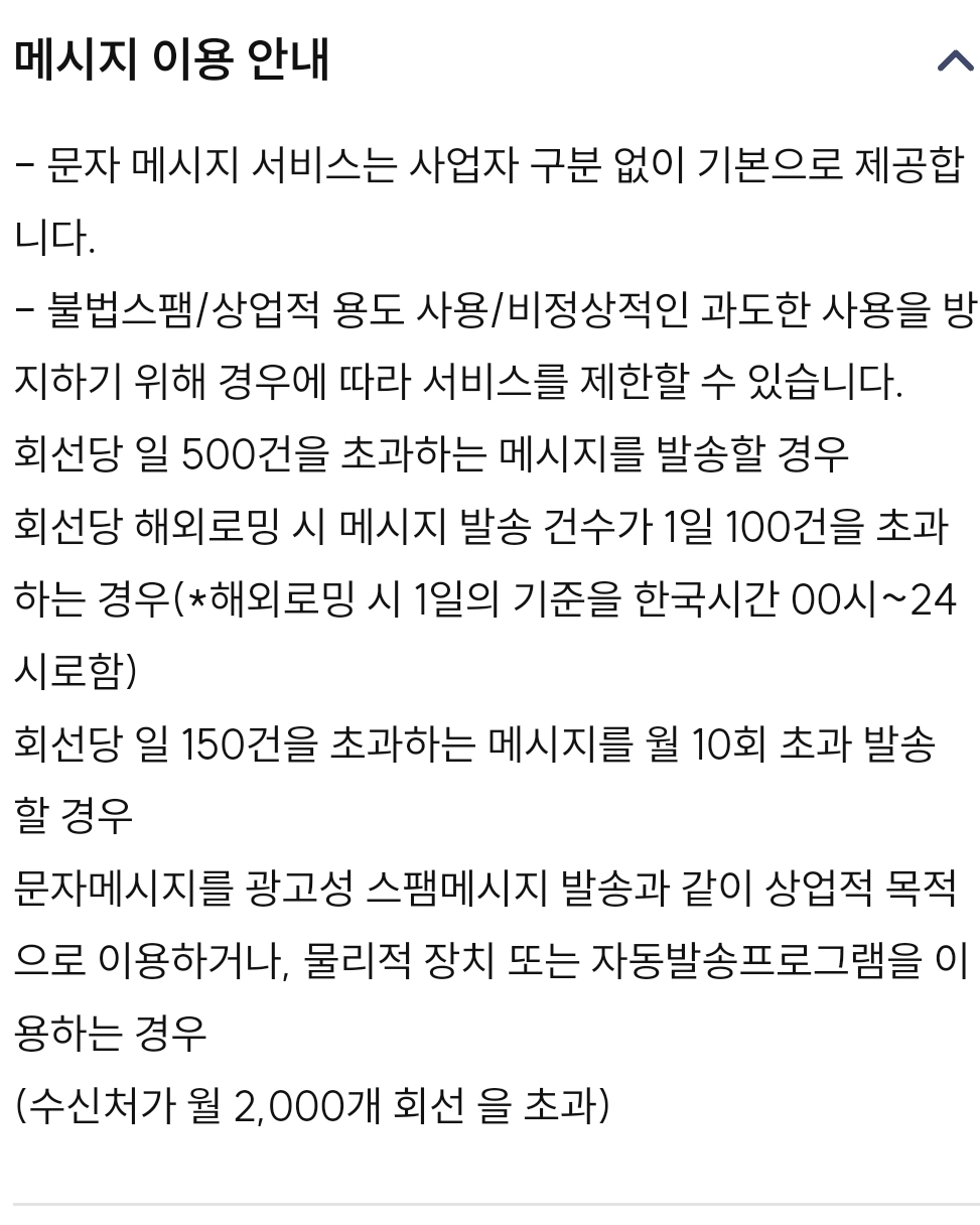 - 회선당 일 500건 초과, 일 160건 이상 월 10회 초과발송시 제한 가능.. 모임이나 조직 동보문자를 여러번 보낼 일이 생길 땐 혹시? 그런데 그런 위치에 있다면 문자대량발송서비스를 이용하는 게 나을지도? [본문으로]