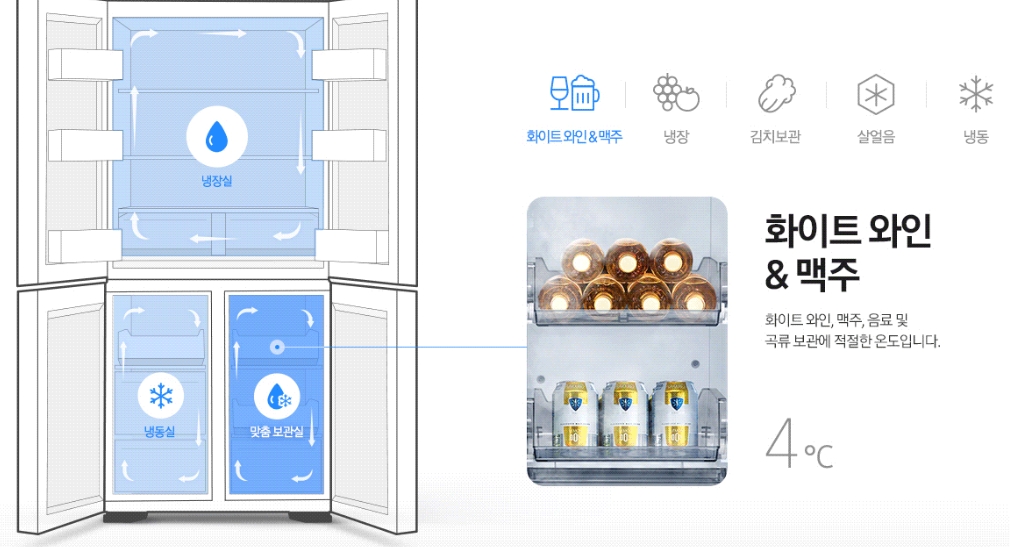 아래 냉동실 2칸 중 1칸을 냉장실로 쓸 수 있는 모델이 있죠. 김치라든가, 잘 하면 와인셀러대용? 그렇게 홍보하죠.