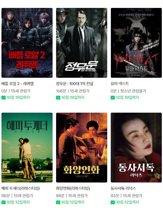 ~10.19까지.. 데스 센텐스, 마세티, 배틀로얄(무삭제), 배틀로얄2: 레퀴엠, 정무문:100대1의 전설, 유아 넥스트