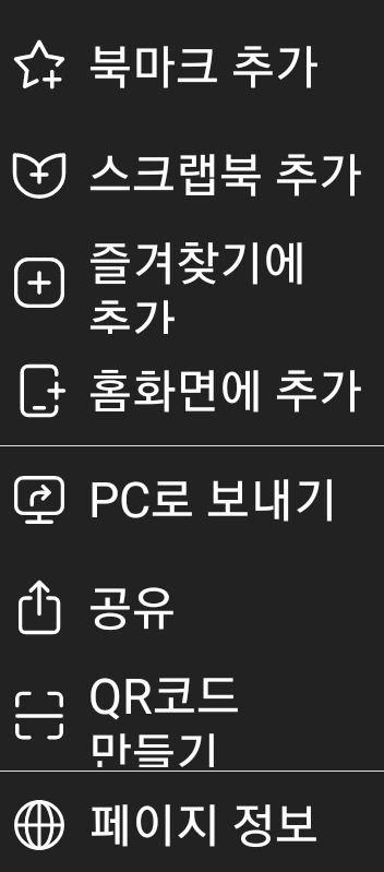 스크랩북에 추가... 파아어폭스, 웨일, 오페라, 그 외에도 웹브라우저마다 북마크대신 쓰라는 듯 기능을 넣던데 저는 관심없어서 모르겠습니다. 데이터 마이그레이션 또는 로컬 백업을 지원하는지도 의심스럽고.