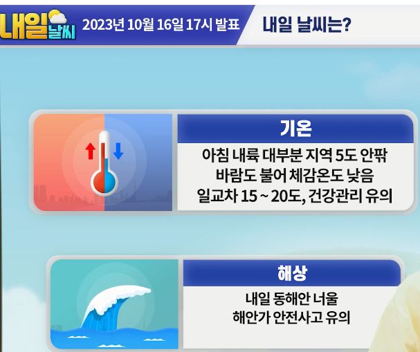 [내일날씨] 내륙 대부분 지역에 아침기온이 5도 내외로 추워요. 10월 16일 17시 기준