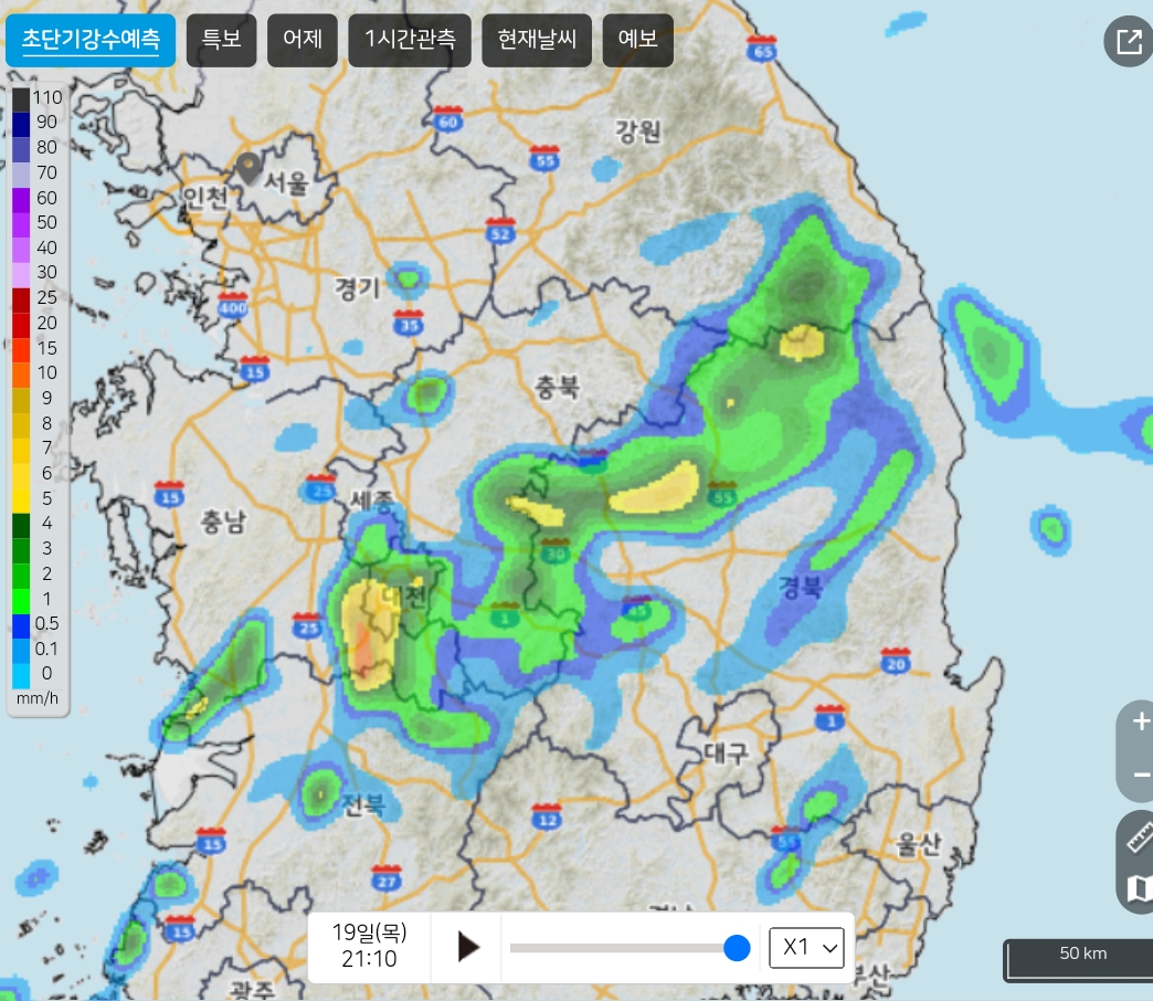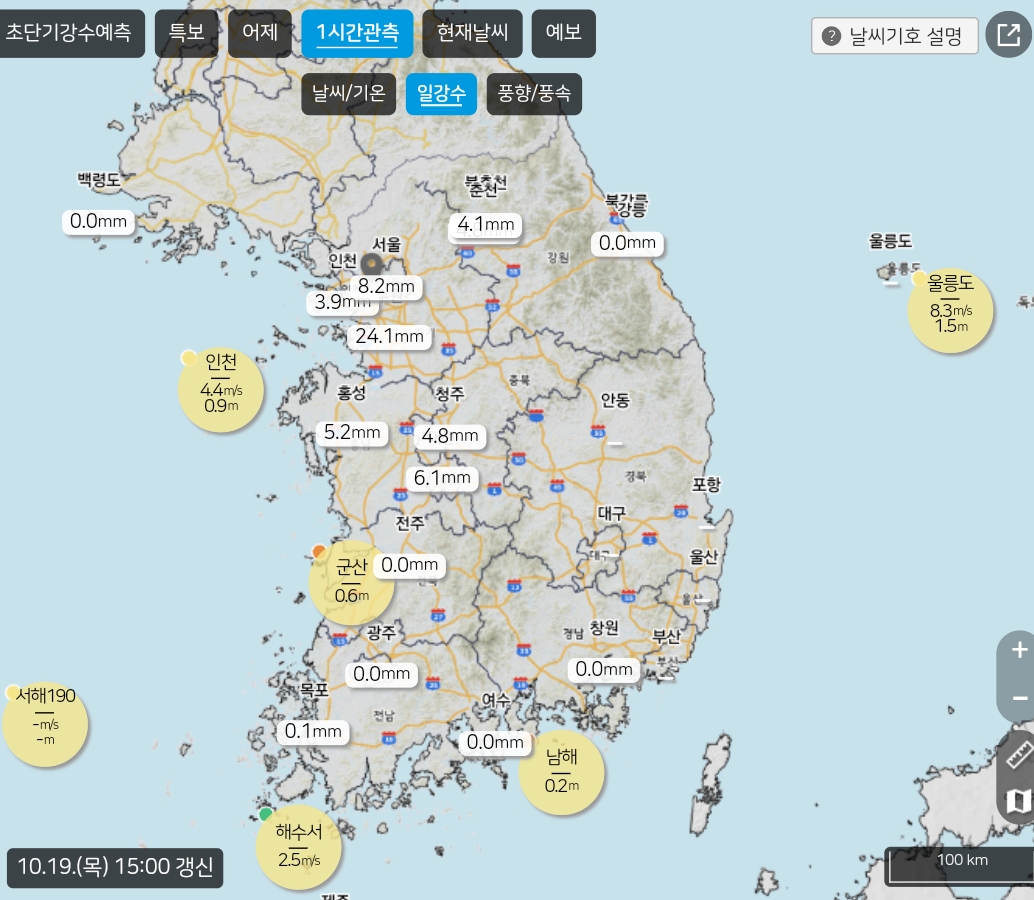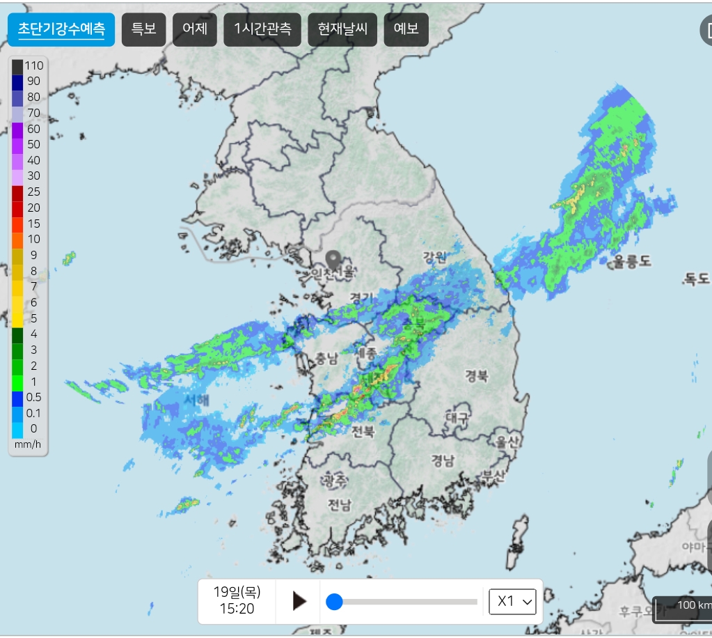 비가 꽤 왔거나 땅을 푹 적시네요. 오늘 밤까지 군산-대전-문경-봉화-울릉도선으로 비구름 본문