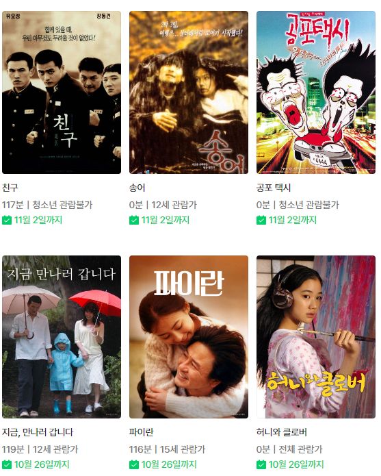 ~10.26.까지.. 사랑도 흥정이 되나요?, 세상의 중심에서 사랑을 외치다, 왓 위민 원트, 지금,만나러 갑니다, 파이란, 허니와 클로버
