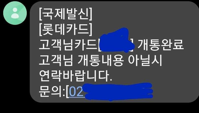 외국발신 전화번호로 롯데카드, 우리카드 발급완료 스미싱 문자 본문