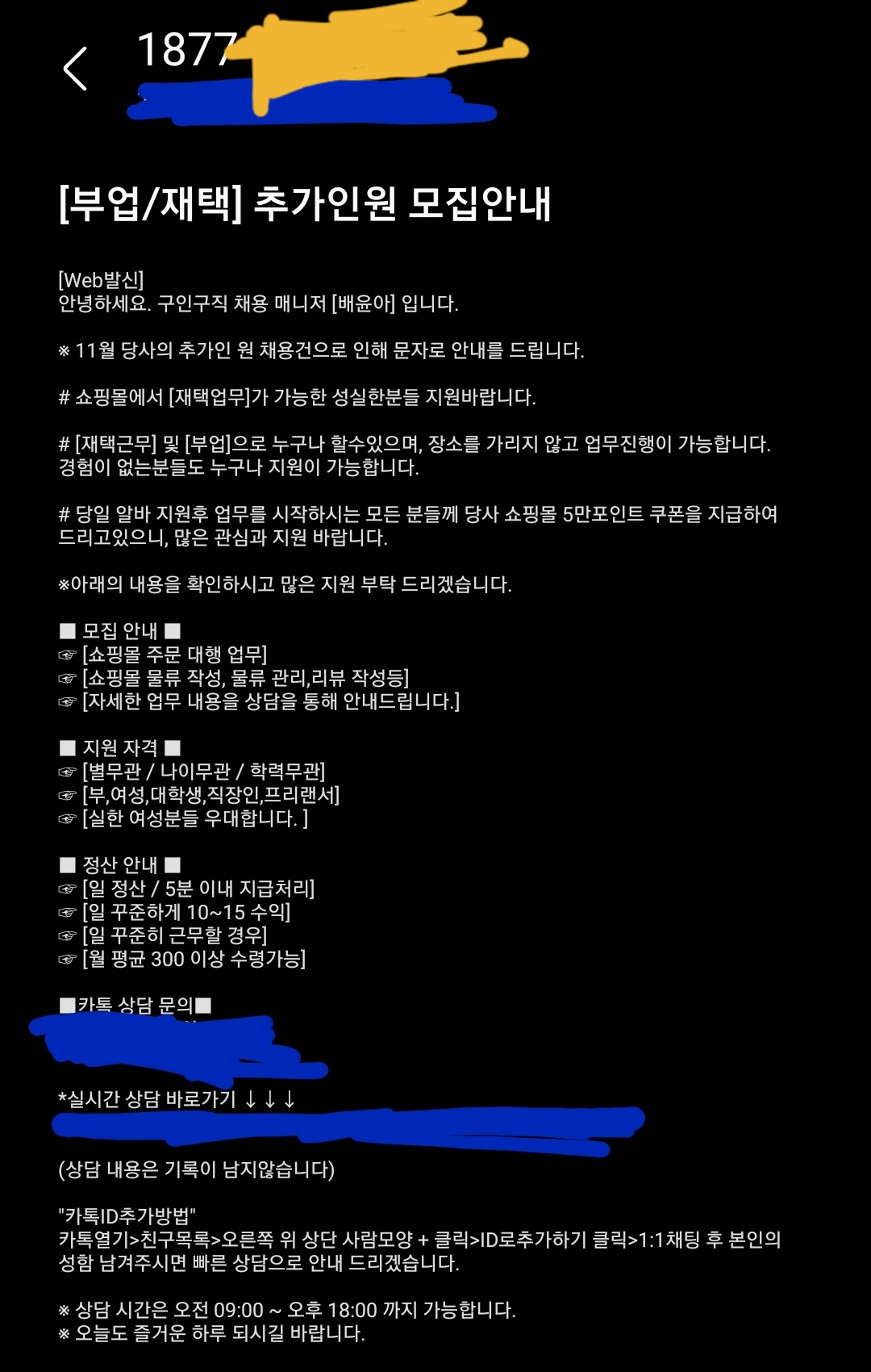 현재 구인중이니 쉽고 편한 고수익알바에 관심있으면 카톡에 친구추가하고 상담요청하라고 유혹하는 문자입니다.