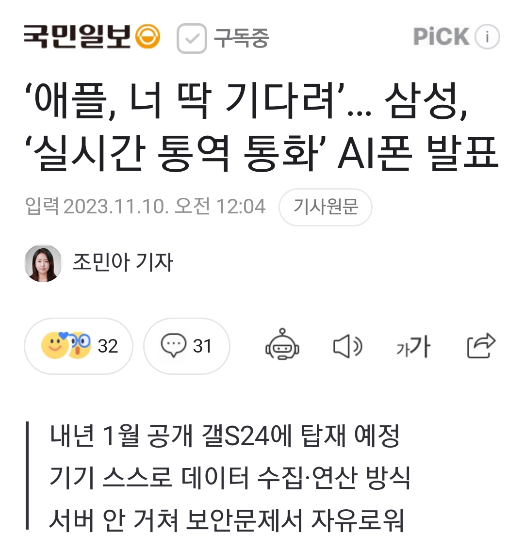 삼성전자, 오프라인 AI통역기능을 내년 갤럭시 S24에 넣을 계획 본문