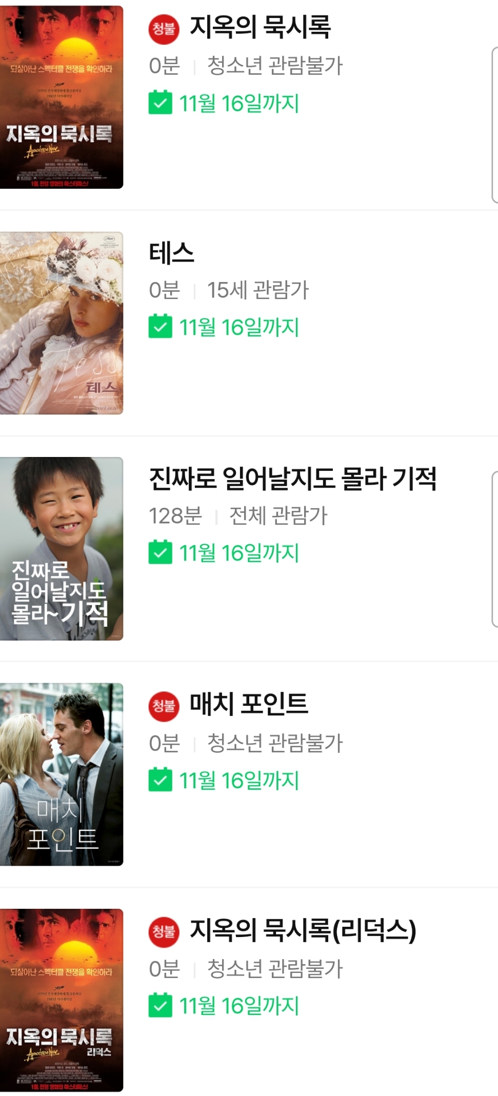 ~11.16.. 지옥의 묵시록 일반판/리덕스/파이널컷, 테스, 진짜로 일어날지도 몰라 기적, 매치포인트