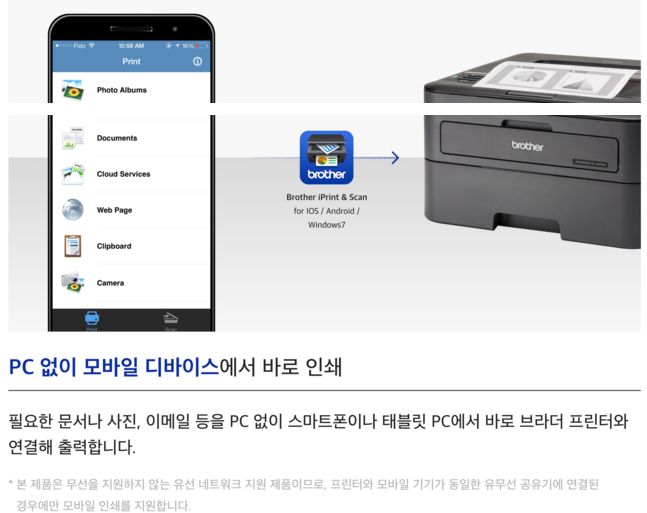 이 제품은 같은 네트워크 - 무선랜포함 - 에 물린 컴퓨터나 스마트폰에서 인터넷공유기를 통해 스마트폰에서 프린터에 연결해 인쇄할 수 있다고 합니다. 앱 마켓에서 다운받는 브라더프린터전용 앱인지 아니면 스마트폰 OS의 일반기능인지는 모르겠지만, 일단 스마트폰에서도 찍을 수는 있다고 상품설명에 표시하고 있습니다. 유선랜, 무선랜이 다 되는 편이 쓰기가 더 편하겠지만 이것도 가능은 하다는 이야기.