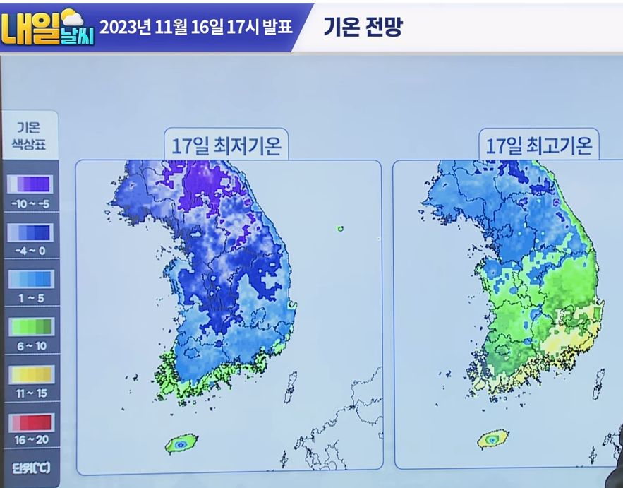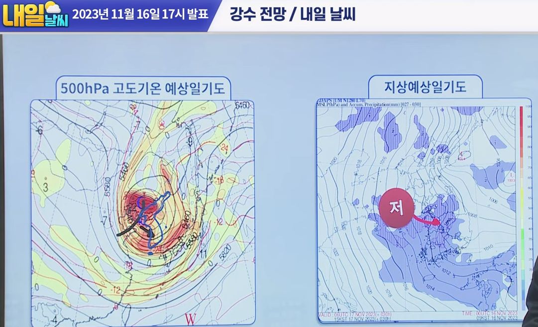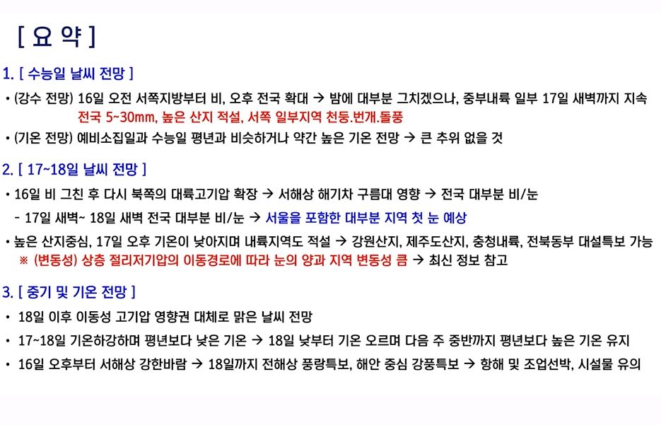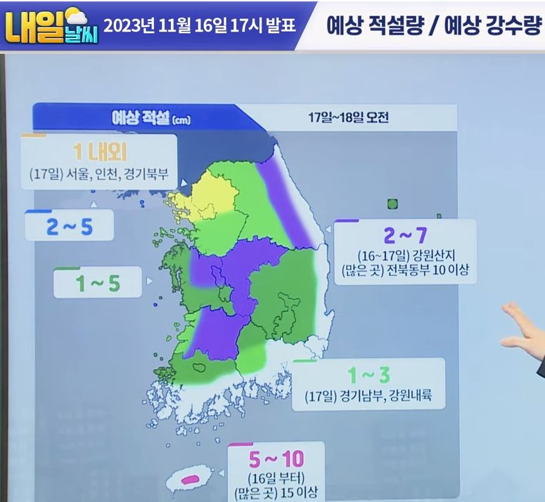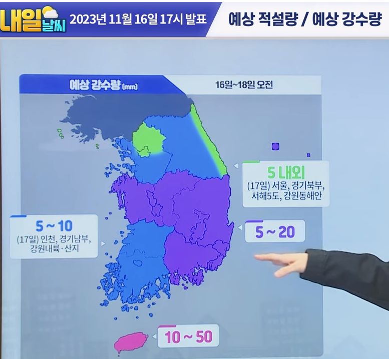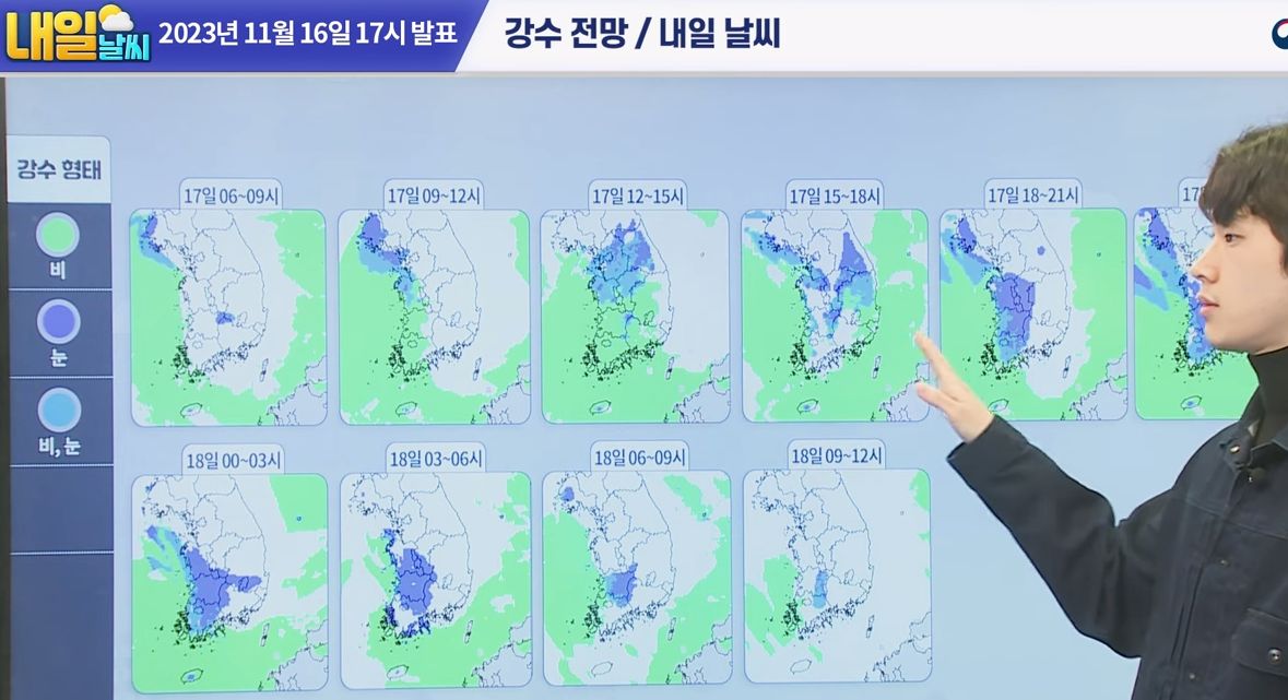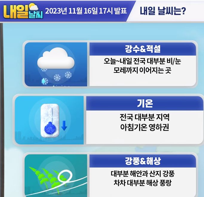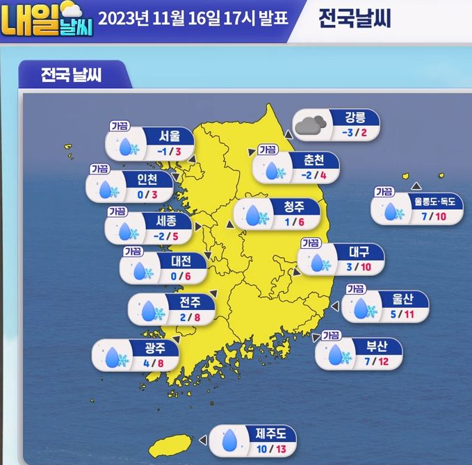 [내일날씨] 오늘~내일 전국 대부분 비 또는 눈, 아침 기온 뚝 떨어져요. 11월 16일 17시 기준