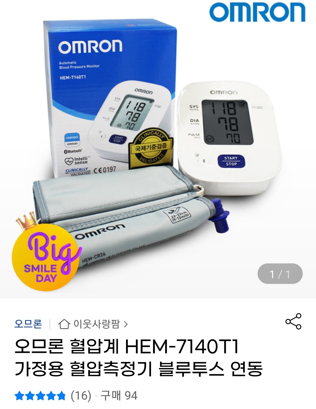 오므론 혈압계 HEM-7140T1 가정용 혈압측정기 블루투스 연동