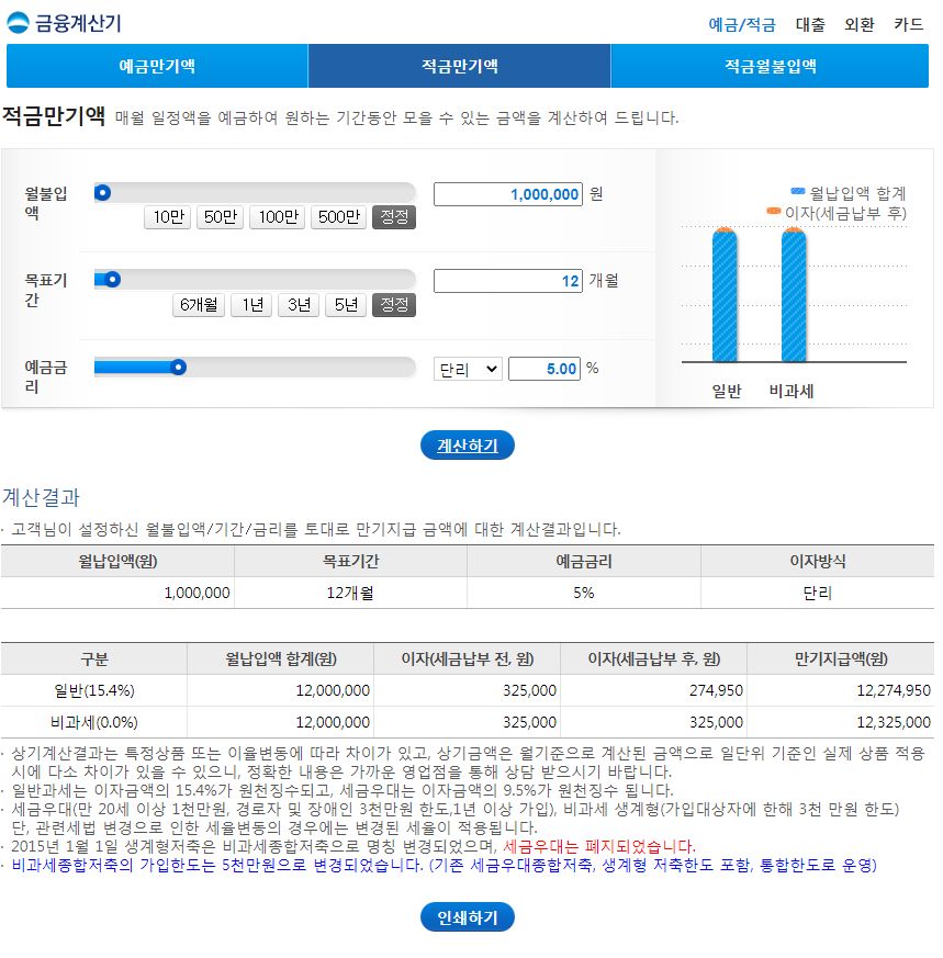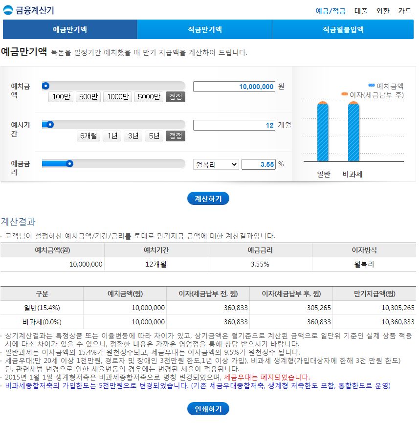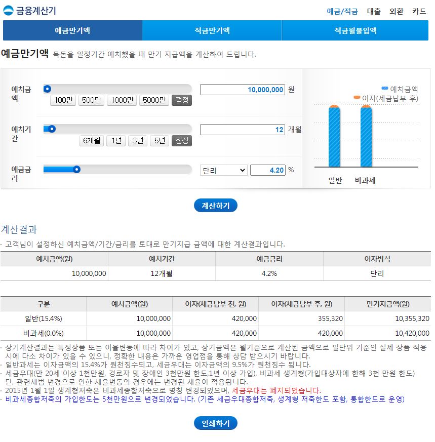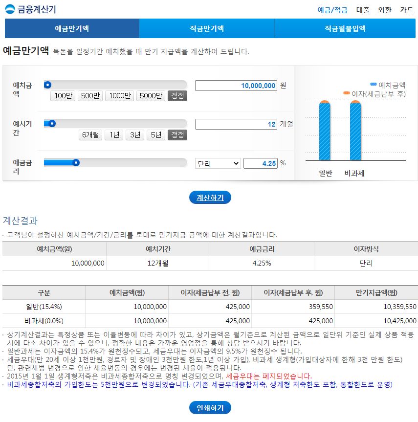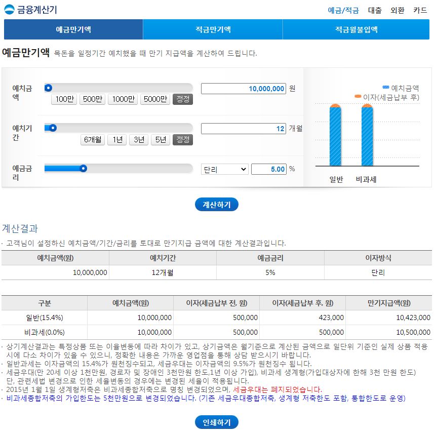예금만기액 목돈을 일정기간 예치했을 때 만기 지급액을 계산하여 드립니다. 일반계산 --> 예치금액 이자(세금납부 후) 일반 세금우대 --> 비과세 계산결과 고객님이 설정하신 예치금액/기간/금