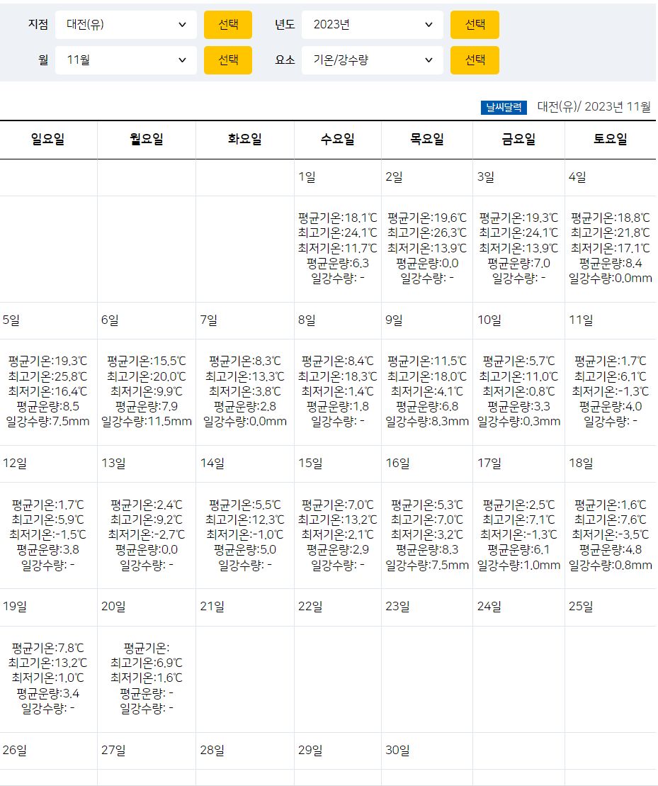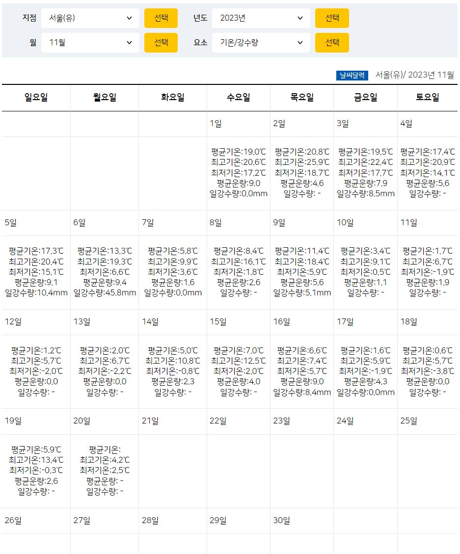 2023년 11월, 서울 대전 일일 최저/최고/평균기온과 평균운량, 강수량 표 (기상청) 본문