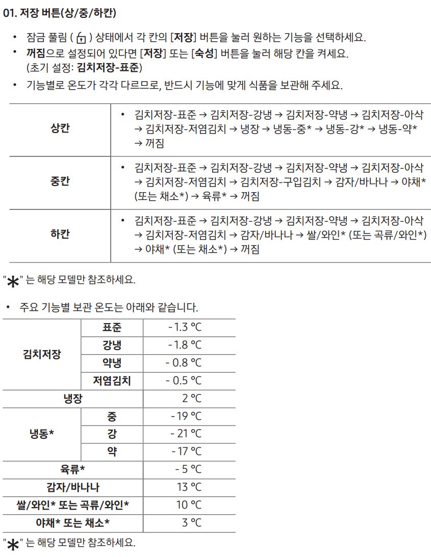 냉동고로 사용하지 않는 중/하칸이라도 김치냉장온도는 0도보다 약간 아래, 육류보관온도는 영하 5도인데, *표시가 된 부분은 세부모델마다 다르다고 하니까 체크. 이 설명서는 표지에 RQ33A71*, RQ33C71* 이라고 적혀있기는 합니다.