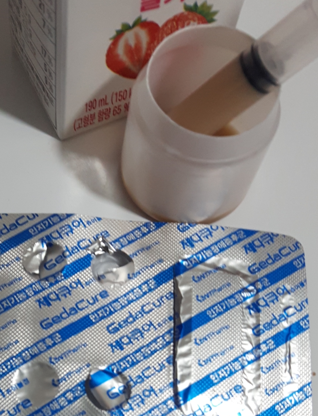 알약으로 나오는데1, 개가 이걸 안 먹고 버티고 알약주입기로도 안 먹으면 녹여 먹입니다.