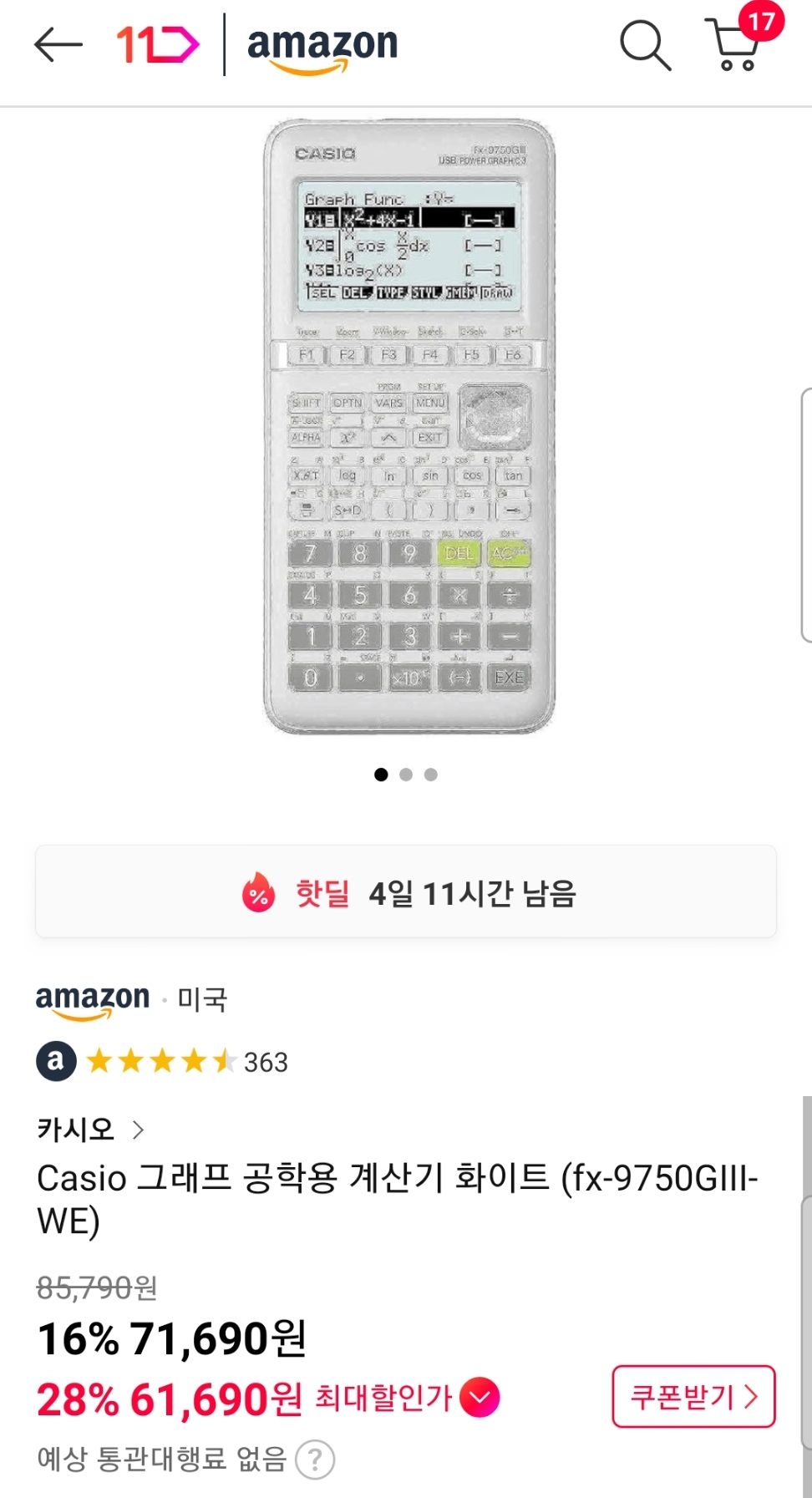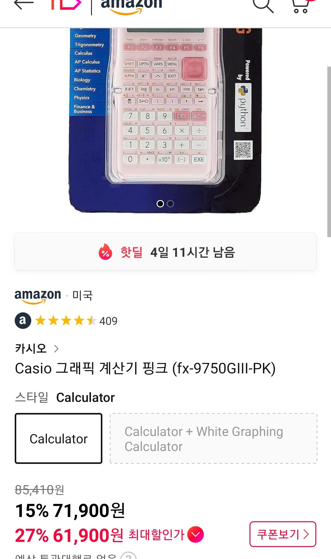 (11번가-아마존) Casio 그래프 공학용 계산기 fx-9750GIII(화이트, 핑크 ~6.2만, 블랙 ~6.3만/우주패스+추가쿠폰받은사람) 본문