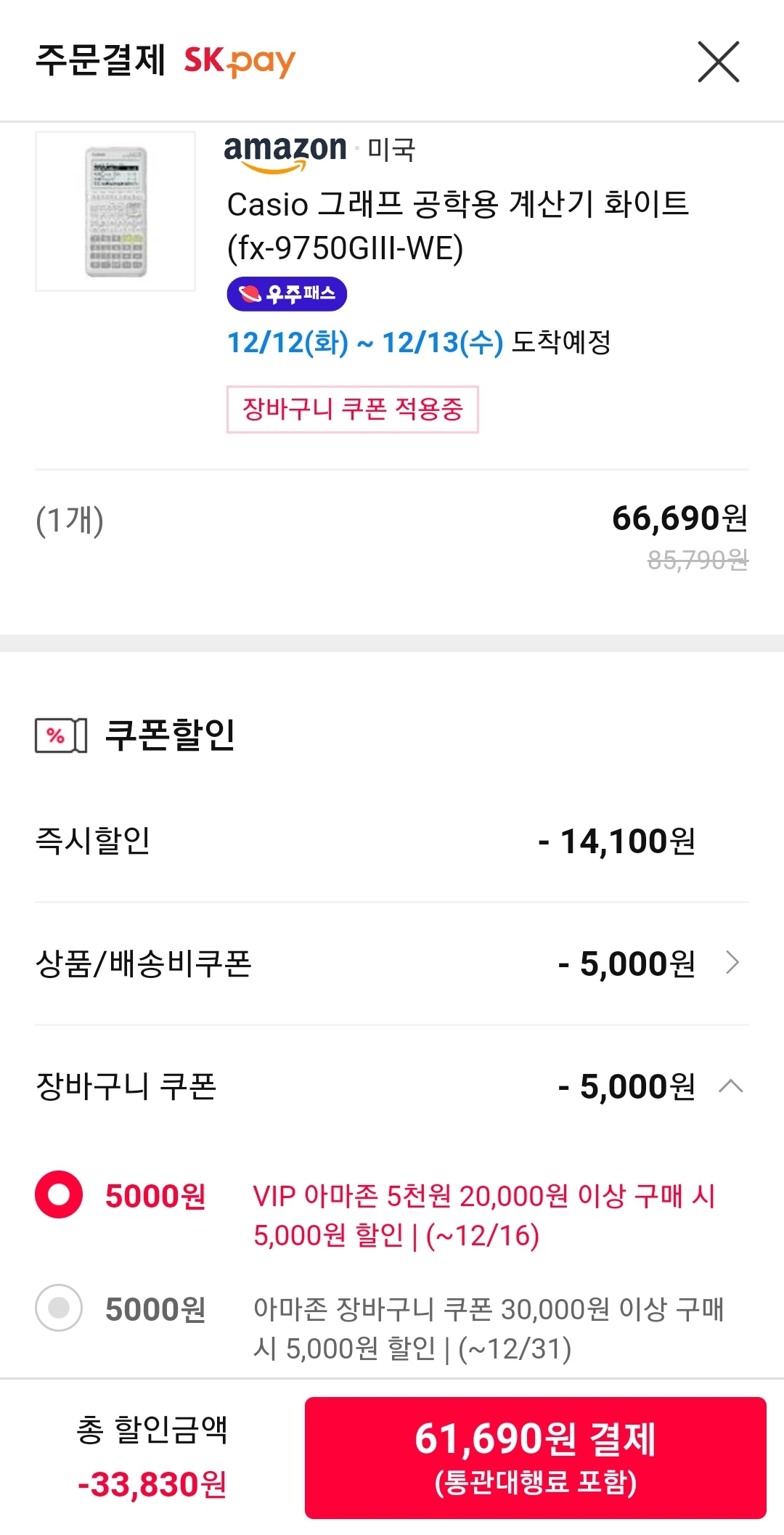 우주패스 회원 전부인지 일부인지 모르겠지만 비밀쿠폰이라고 들어온 게 있으면 중복적용됩니다. 그렇게 해서 6.2만원.