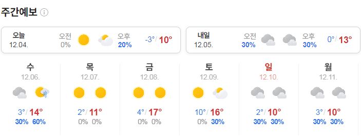 | (2023.12.3.날씨) 서울 대전, 월요일 아침까지는 영하날씨, 수요일 낮 비 있음 (0) | 2023.12.03 |