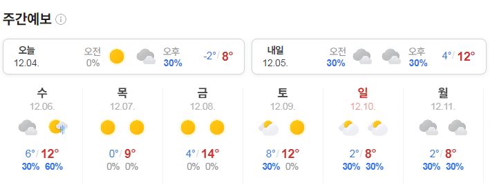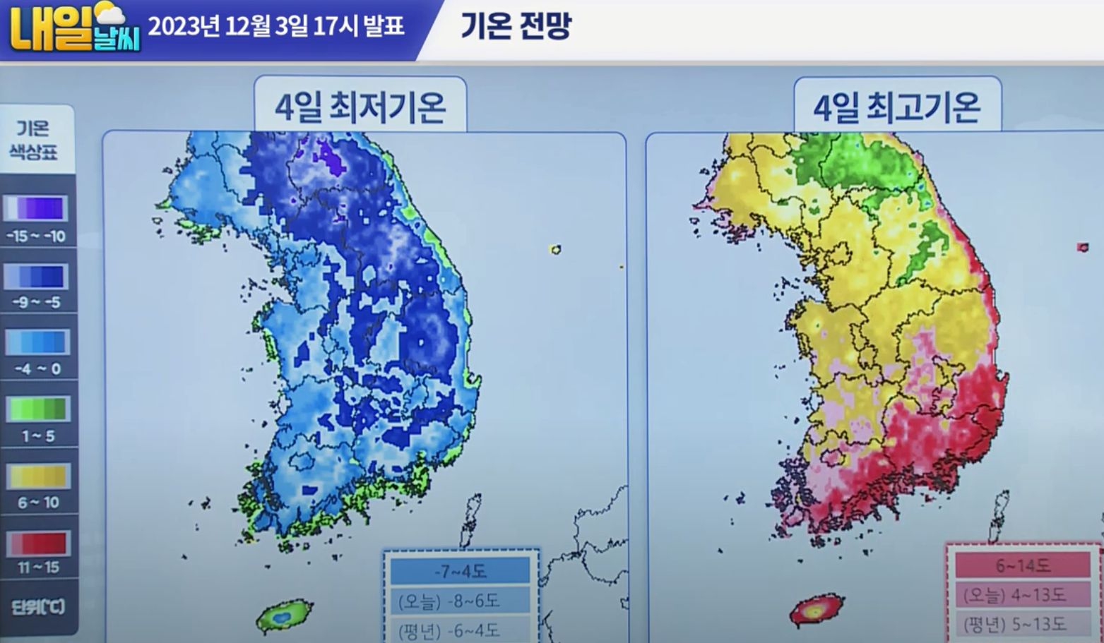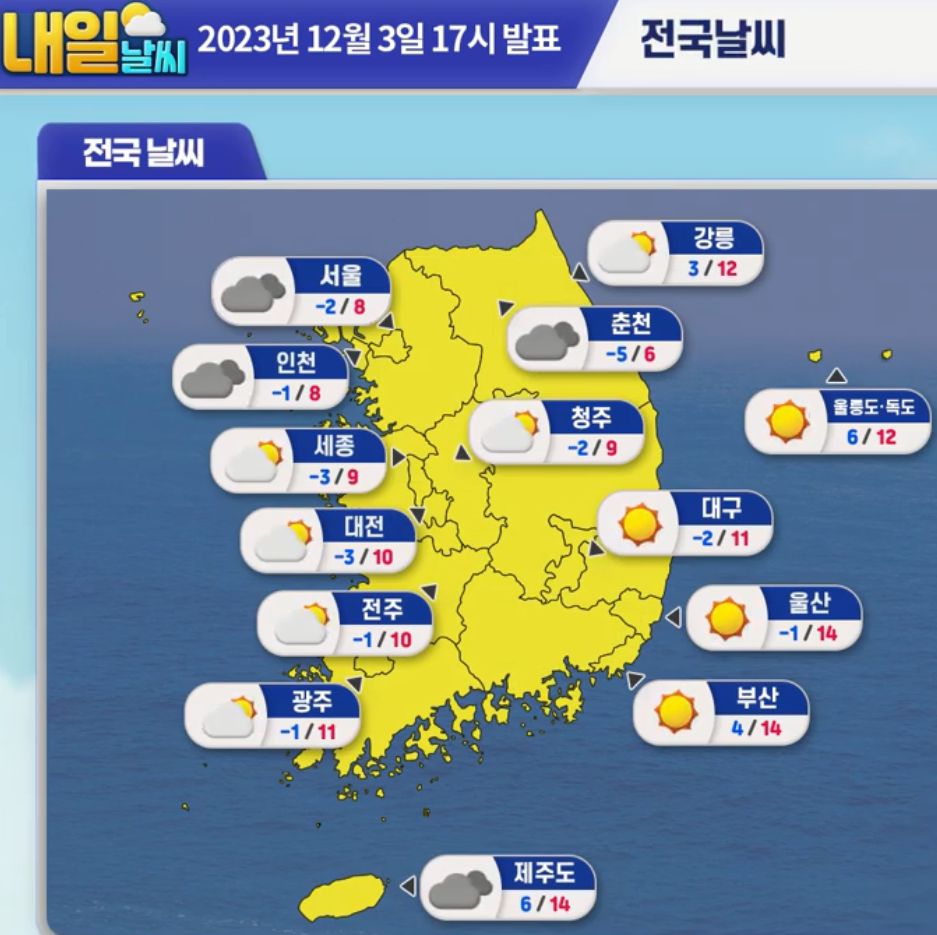 (2023.12.4.월 날씨) 서울, 대전 월요일 아침기온 영하. 주중에 낮최고기온 10~15도 이상까지 상승 본문