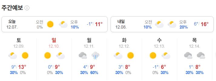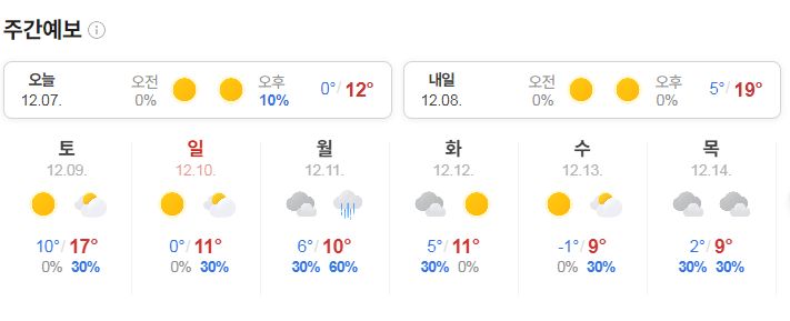| 2023.12.11.(월)~ 주간 날씨예보: 주중 비, 주말 강추위. 기상청 12.10.저녁기준 발표 (0) | 2023.12.11 |