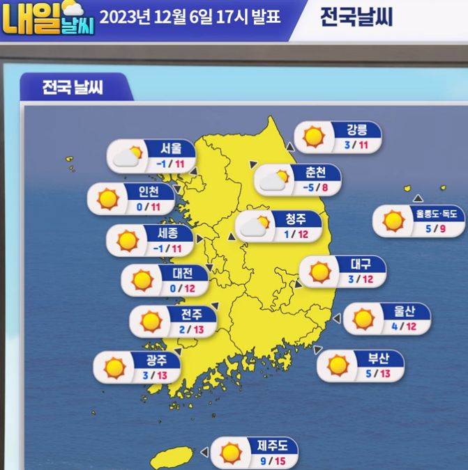 | (2023.12.4.월 날씨) 서울, 대전 월요일 아침기온 영하. 주중에 낮최고기온 10~15도 이상까지 상승 (0) | 2023.12.04 |