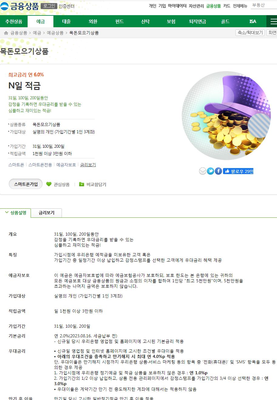 우리은행 N일적금: 최대 200일, 금리는 첫손님 6%, 기타 5%