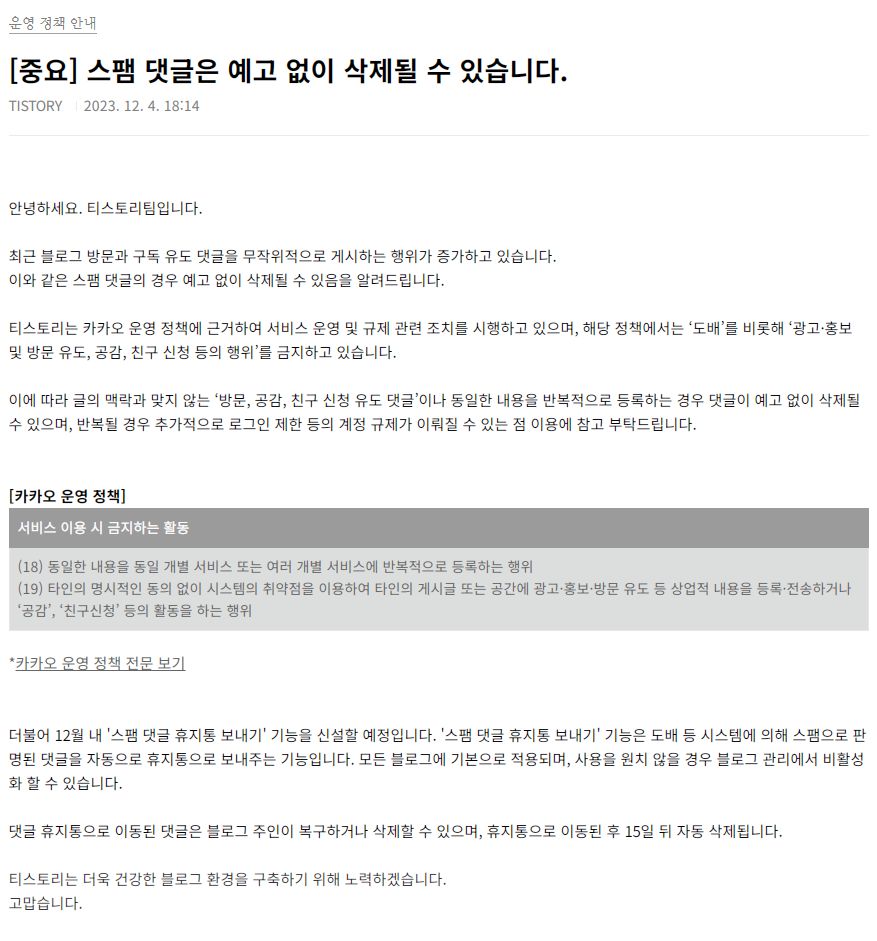 티스토리, 스팸댓글 직권삭제 및 스팸행위자 계정규제정책 공지/:/ 스팸댓글 휴지통 보내기 기능 신설 본문