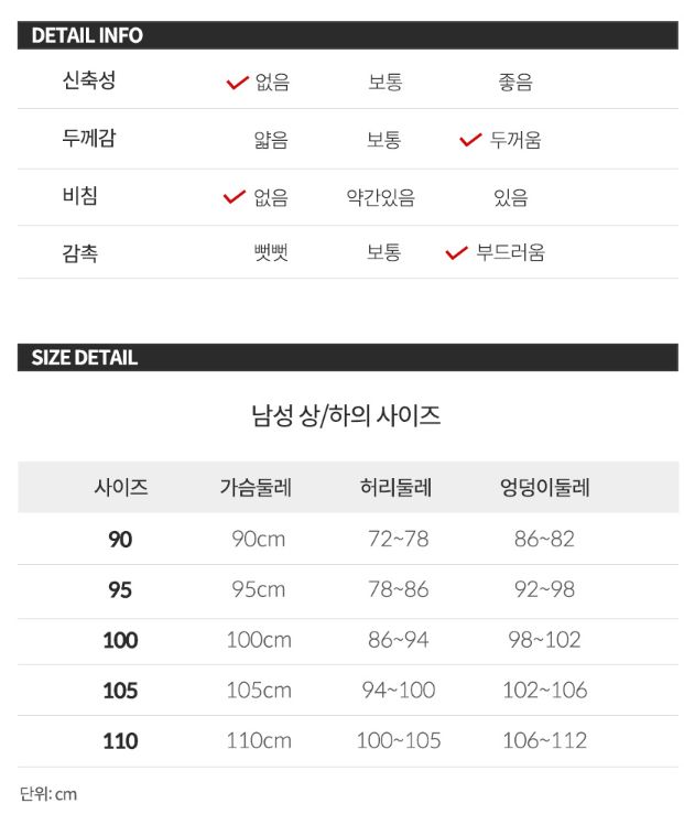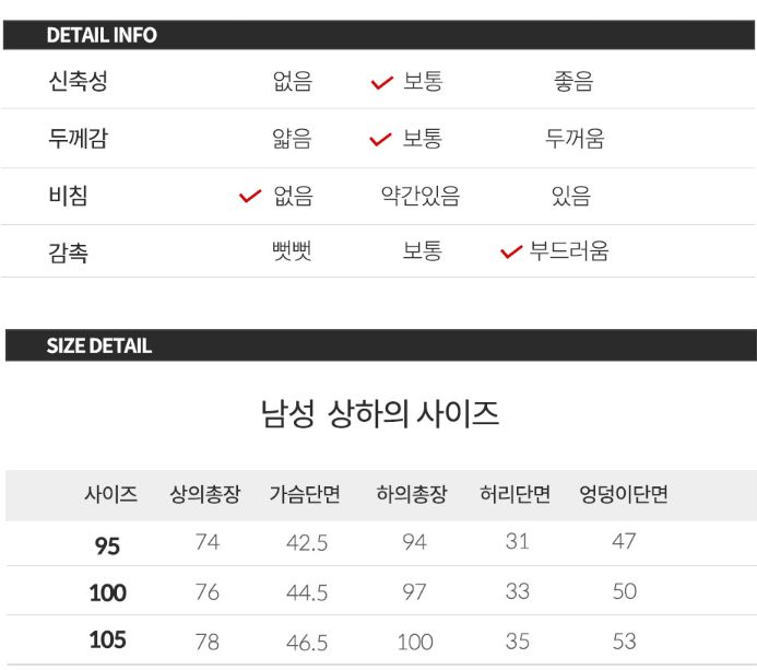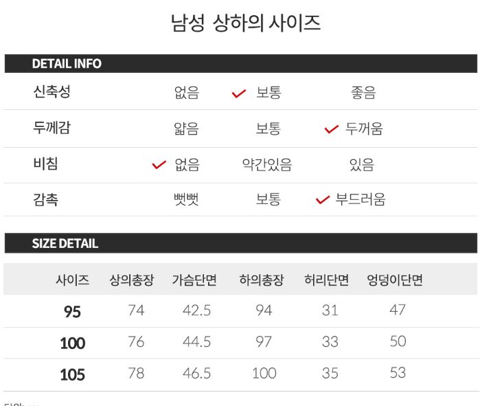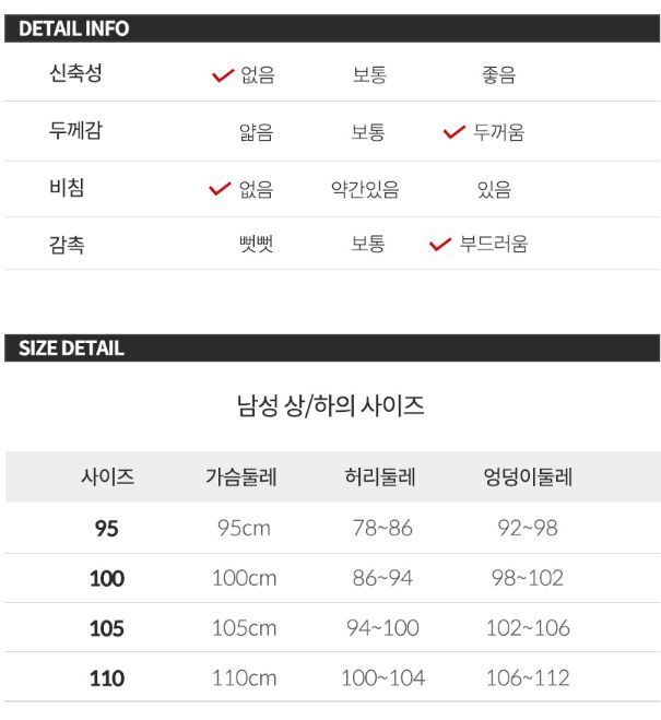 (아마도 더 과거 모델번호일 이 회사 다른 제품을 보면, 상의는 어깨, 가슴, 소매길이, 총길이(+ 허리둘레?), 하의는 허리둘레, 엉덩이둘레, 밑위, 총길이라는 식으로 보통 옷처럼 자세하게 적은 것도 찾아볼 있습니다.)