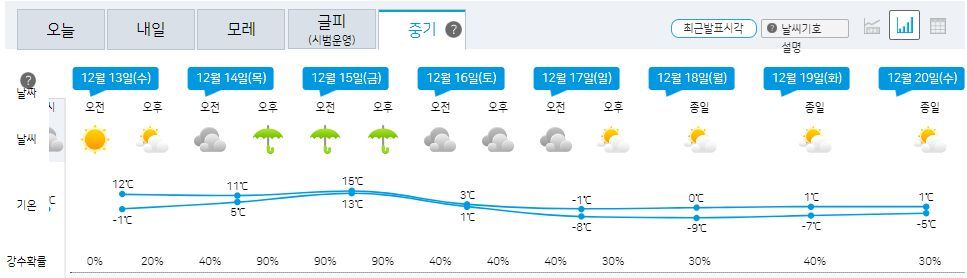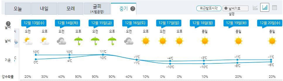 | 중기 일기예보, 어제(2023.12.13) 기준 기상청. ~12월 23일(토) (0) | 2023.12.14 |