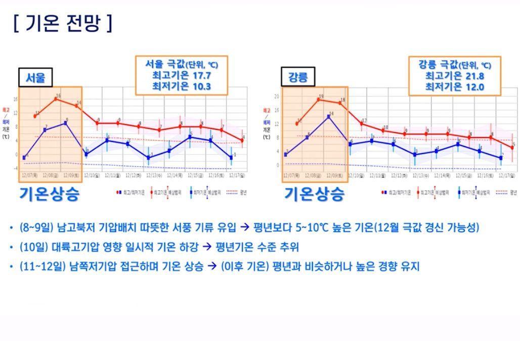 기온전망이, 7일 오후 예보와 오늘(10일 새벽) 예보가 많이 다른 점입니다. 그때는 아래와 같이 다음 주말(12월 17일경) 기온은 그런대로 온건할 것이라고 봤는데, 위에 갈무리한 기상청 주간 예보를 보면, 다음 주말은 보일러와 수도 동파를 걱정해야 할 만한 완전 한파입니다.