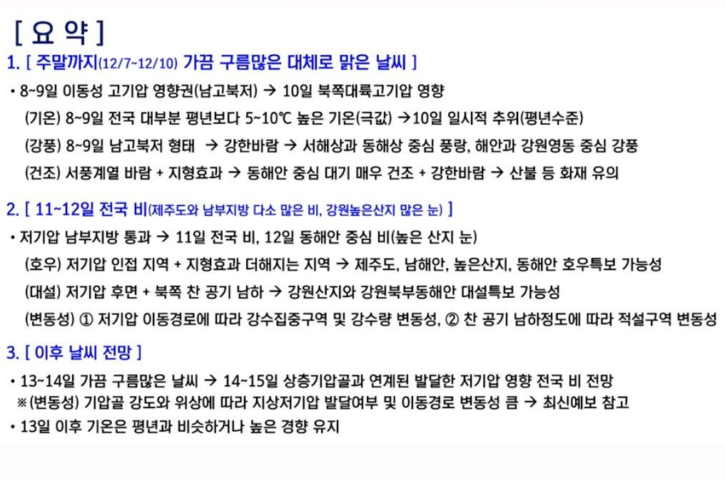 2023.12.10.(일) ~ 12.20.(수) 일기예보: 주중 비, 내주말 한파 본문