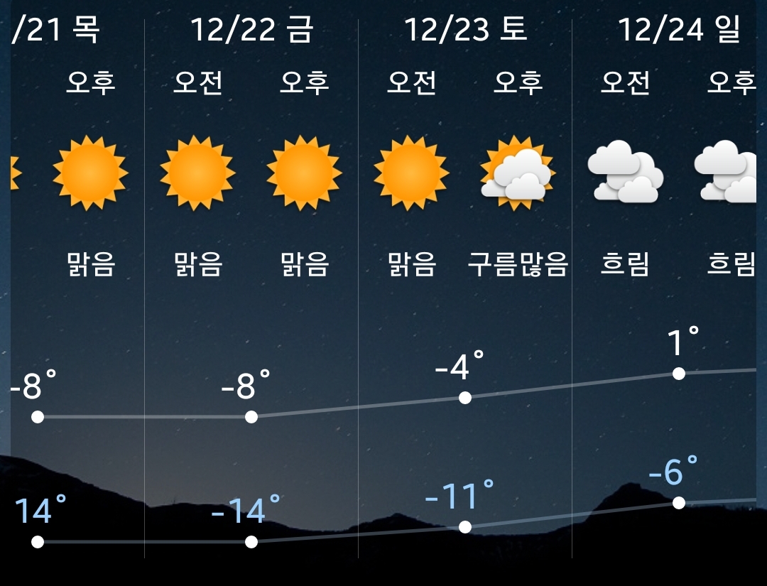 | 2023.12.21.기상청 저녁예보~ 주말까지 풀려가지만 추위는 계속 (0) | 2023.12.21 |
