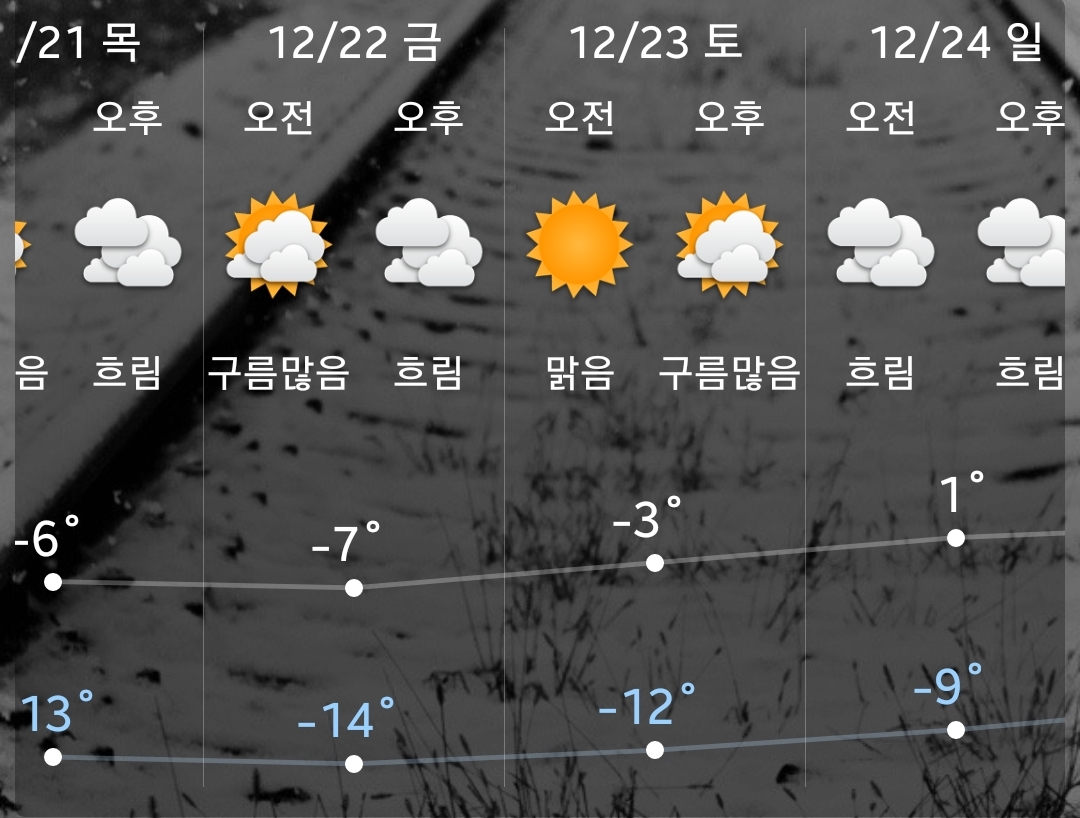 | 중기 일기예보, 어제(2023.12.13) 기준 기상청. ~12월 23일(토) (0) | 2023.12.14 |