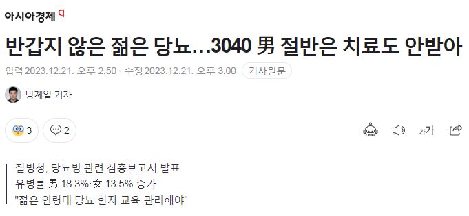 3-40대 당뇨병 인지율-치료율 저조..집중관리 필요 - 의학신문 2023.12.21