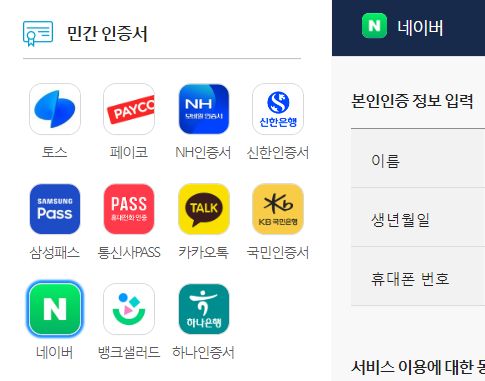 토스, 카카오, 네이버 인증서를 포함한 민간인증서로 로그인할 수 있습니다.